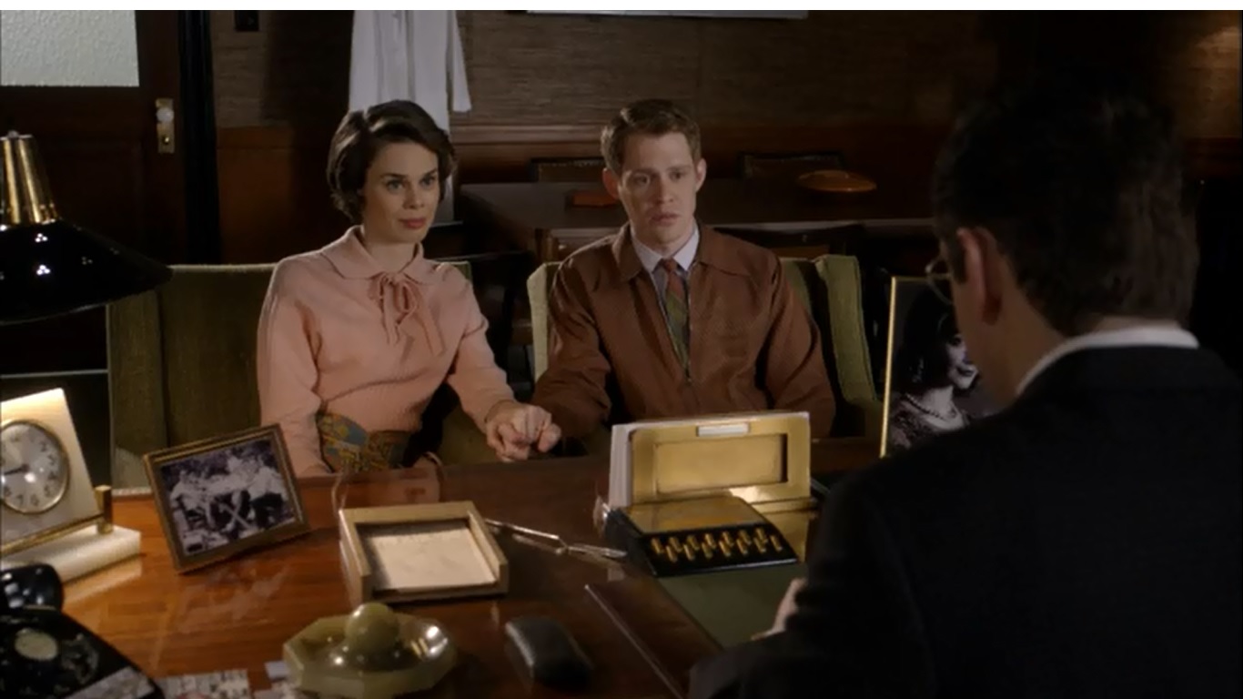 Bill and Virginia are in a sexual game of tug of war. Masters is the first to initiate dinner plans, but Johnson turns him down. Once Bill, through Virginia’s urging, is driven back into the arms of his wife, there’s a hint of disappointment when Bill is the one who turns Virginia down so he can spend time with his wife. Again, we’ve seen little to no evidence that Virginia has any physical attraction to Bill, so it will be interesting to see how her feelings for him develop. Side-note, we don’t learn much about temporary secretary Adelaide and she’s tossed aside so quickly that she seemed expendable. I get that Bill is a very by the book person, despite his growing feelings for Virginia, but I thought he came off as a bit harsh to just get rid of her so soon, especially if it was just for organizing things alphabetically.