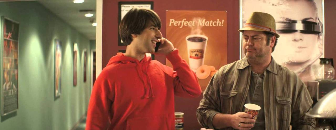 Despite being put out of her parent’s home, Carol continues working, seeking accents from anyone she can and receiving the help of the producers at the Sound Mix a Lot studio, including Louis, played by Demitri Martin, and Hernes, played by the man, Ron Swanson himself, Nick Offerman. Louis, as evidenced by anything he says or does when Carol is mentioned or around, is pining after Carol, but does keep it professional. To the point where he will keep talking on the phone to her even when Hermes knows Carol already hung up. But because he can’t be straightforward from the start, the quirky desk girl pines for him when he’s available. Plus, let’s face it, if all guys and gals were straightforward with their feelings, romance films would be pretty short.