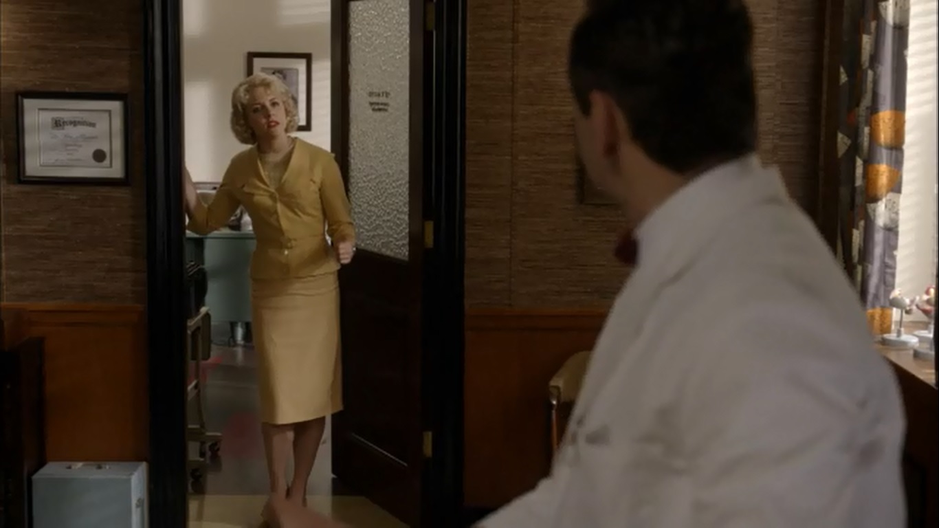 Bill’s all about numbers and data, which Virginia warned Jane about, since it distracts him. Without Virginia around, Bill is less quick to think about the theatrics of sex. The line about Bill being bogged down by statistics could have been just a throwaway, but it serves a greater purpose when Bill returns from Dr. Ditmer’s lecture and realizes that a bunch of data won’t hold an audience’s attention. He needs a hook, something to captivate or at least interest the audience, so why not go with penis size and footage showing the inside of a woman’s vagina?