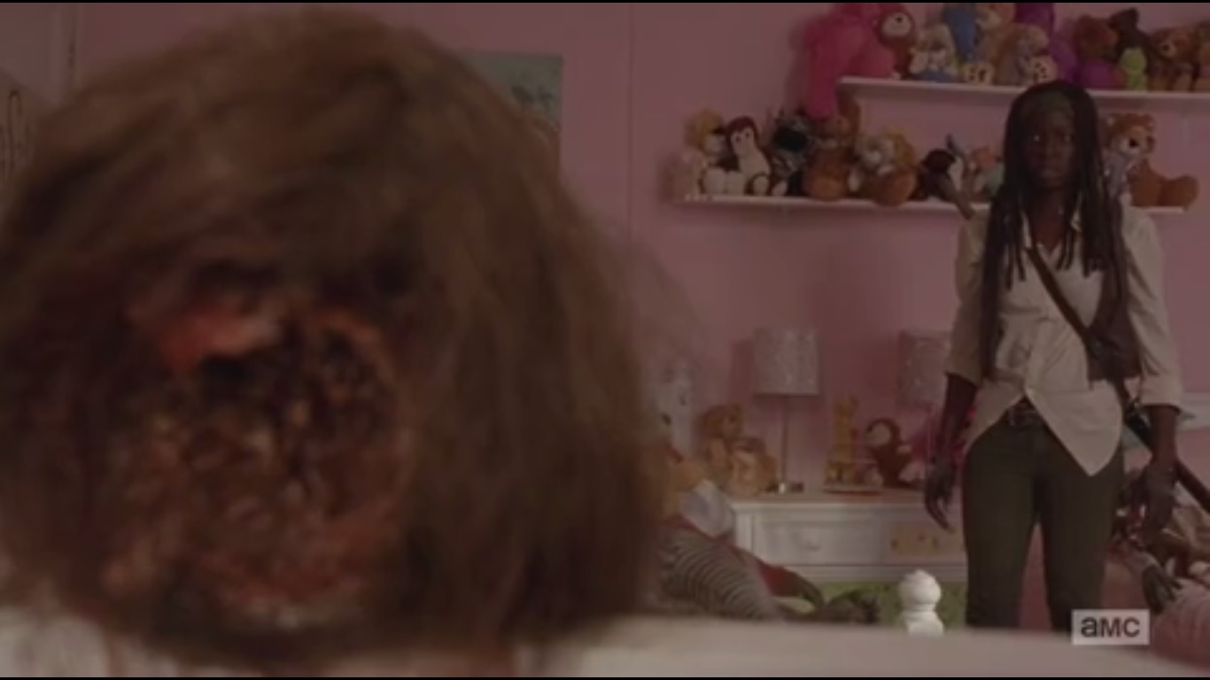 Michonne finding the girls’ room was one of the creepier moments of the episode. It’s an interesting juxtaposition: the innocent of a child’s room against the dead bodies laying almost perfectly on their furniture and bed.