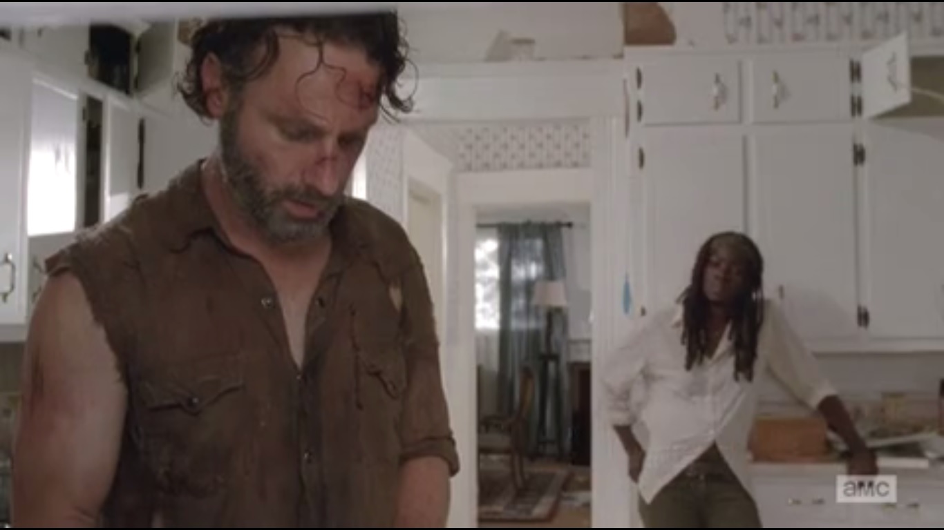 This leaves Carl and Michonne to try and bond as they make their way through an abandoned home. Try. Michonne tries what should pass for humor, but comes off as awkward. She does get around to talking about her life before the walkers and speaks about her son. But because this is Michonne, she’ll answer Carl’s questions: one at a time, one room at a time and after said room has been cleared. Picky, picky.