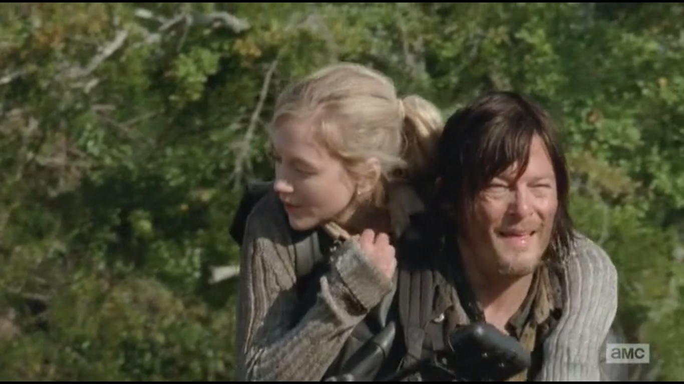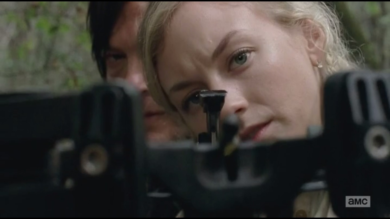 The B storyline involves the continuing adventures of Daryl and Beth, who’s still learning how to properly use a crossbow. She tries to kill one walker, but steps on a trap that ensnares her leg in the process. Daryl takes her on his back for a serious piggyback- his words, not mine- and they arrive at a cemetery.