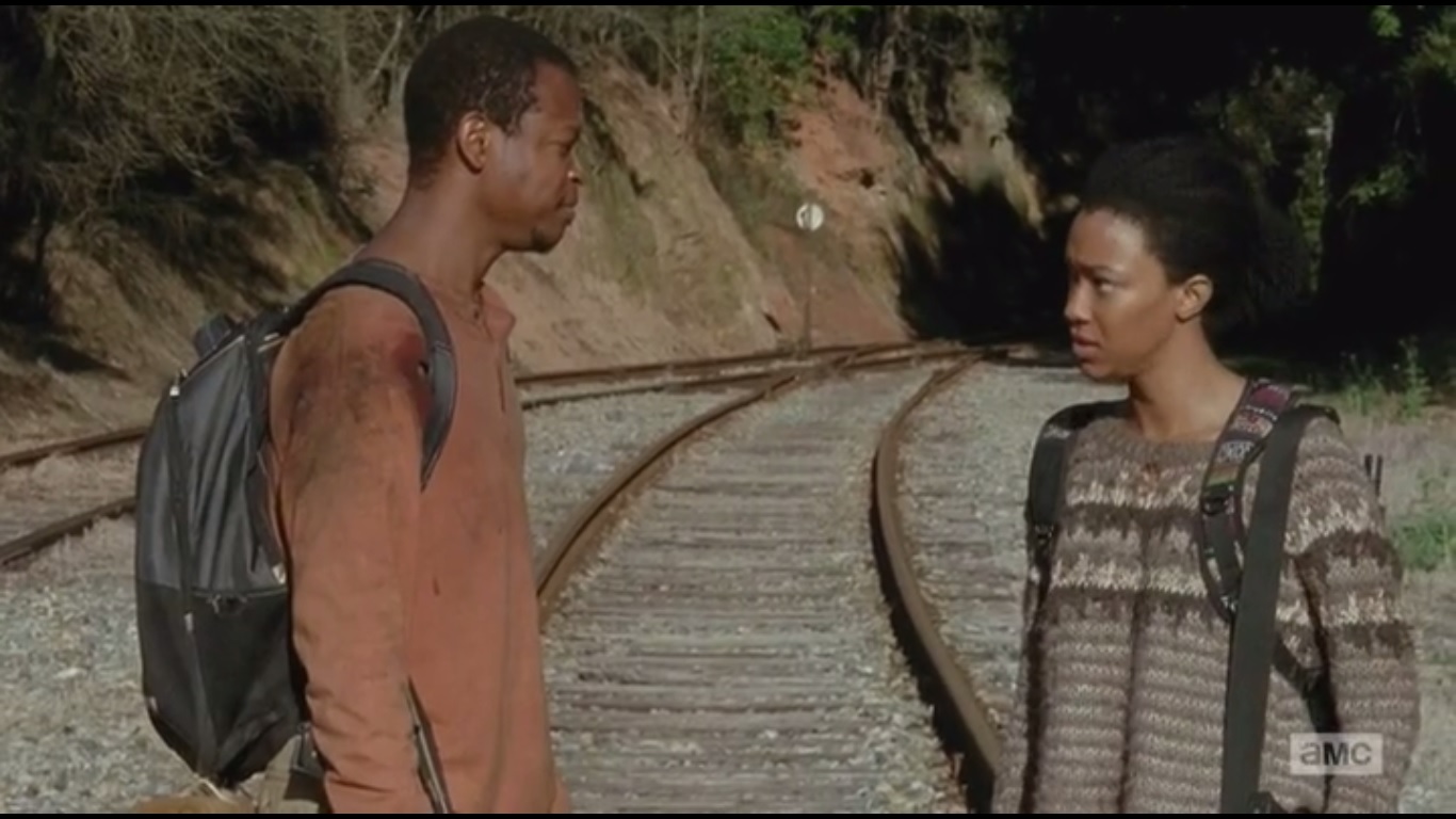 Bob had Sasha pegged down when he called out for being afraid. Only when she admitted to Maggie that she was afraid did Sasha accept the idea of sticking together to find the others instead of just finding another place to stay. To me, Sasha comes off as the most careful of the three: she wants to take things slowly, she’s always keeping track of how many bullets they have and instead of just planning on the spot, she prefers to find a safe location so she can plan things out. I can’t get angry at Sasha for wanting to be careful. It’s clear that she cares for the group as much as the others, but, being the rational thinker, she believes the worst case scenario that everyone else is dead. As such, her drive is to keep moving to keep herself alive. It’s at this point where, although she and Bob travel a similar path, their roads split. The train track metaphor could not have been any heavier handed.
