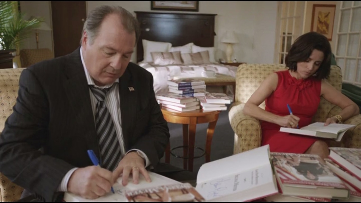 Selina and Ben pass the time by signing books that she didn’t even in write: politics in a nut sack, really. We even learn about some of the alternate subtitles proposed to Selina: Red, White and Yellow or Hands of Our Children. Riveting. As tiring as all this is, if Selina’s serious about running for President, she has to endure 18 more months of this. Not exactly the most exciting job.