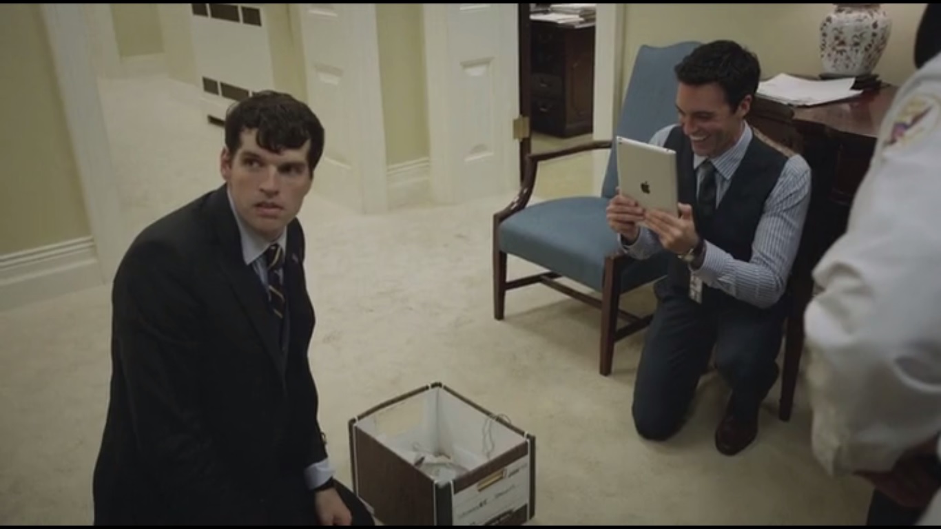 Over in D.C., Kent demands Jonah’s White House pass. He’s done. Out. He knows all about WestWingMan.net. The photo that Jonah posted roused the suspicion of the press. Deleting the photo only made it worse. It’s now impossible for the White House to remain silent on the President’s secret, so he will be making his announcement today. The team heads out to alert the major news networks, though Kent advises them to not interrupt any major sporting event. Unless it’s golf, anyway.