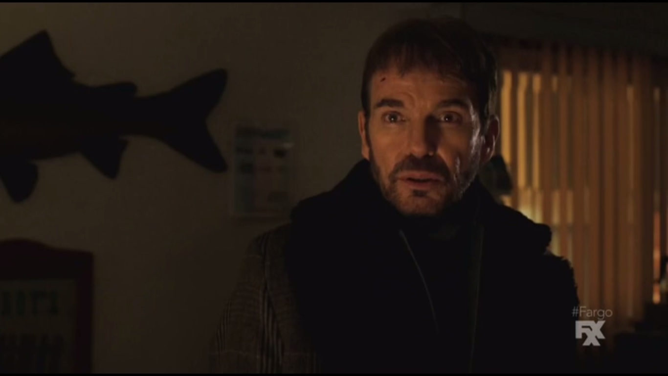 We’re then introduced to Lester Nygaard, played by Martin Freeman, and his wife, Pearl, played by Kelly Holden Bashar. Lester is a salesman and a bit of a sad sack. And poor guy, he gets a run in with an old high school bully, Sam Hess, played by Kevin O’Grady, who reminds him and his two sons about how he once put Lester in an oil drum and banged his now wife of 15 years. Sam lays it on thick and it looks like he’s about to sock Lester in the face, but he doesn’t.