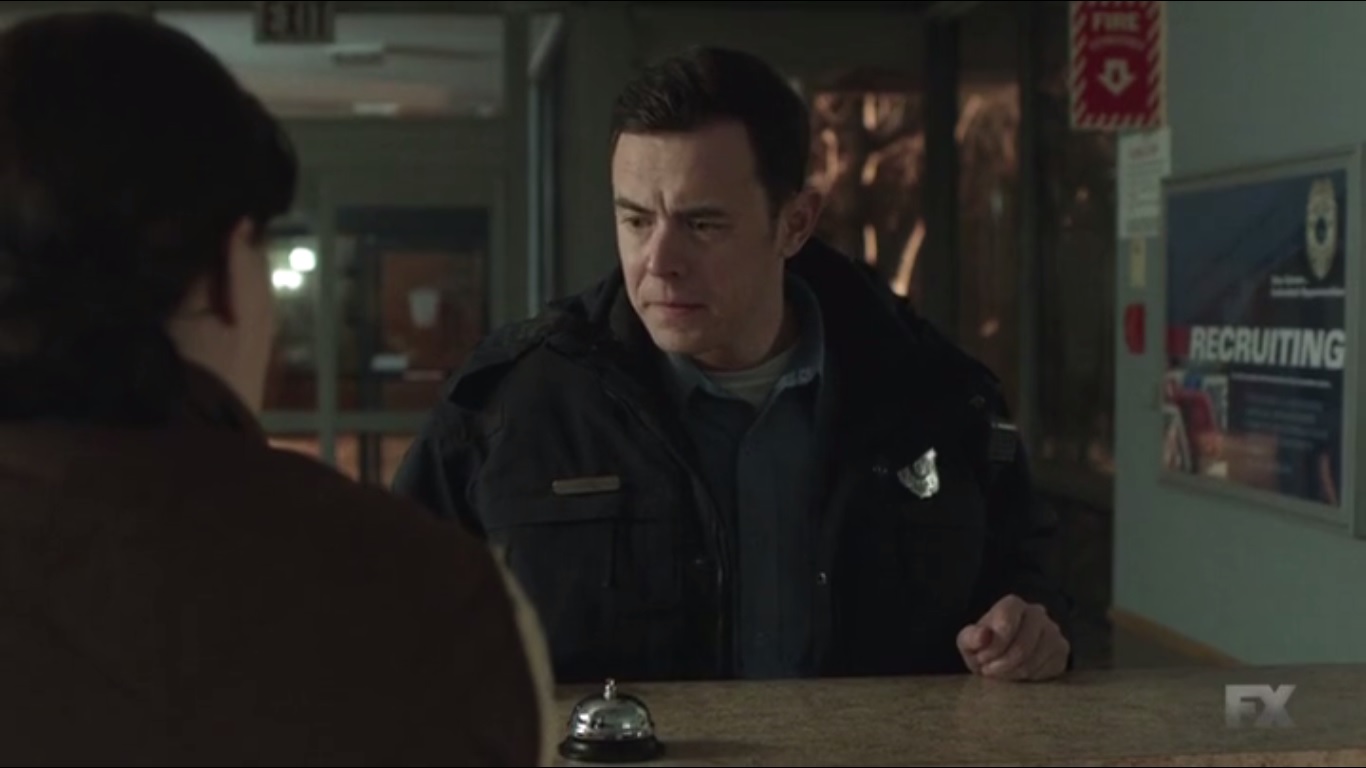 In Duluth, Officer Gus Grimly recounts his run-in with the mysterious man and decides to run the license plate. The name and face of one Lester Nygaard pop up. Needing to talk to the chief, he asks Molly, played by Tammy Roberts, about the lieutenant’s whereabouts. He’s in the john. So, like anyone else would, Gus enters and tells the lieutenant about the car. Soon enough, the lieutenant emerges and asks Gus why he pulled over a stolen vehicle and only let the driver go with a warning. He tells Gus that it’s up to him to find it, but he’ll also have to admit that he screwed up.