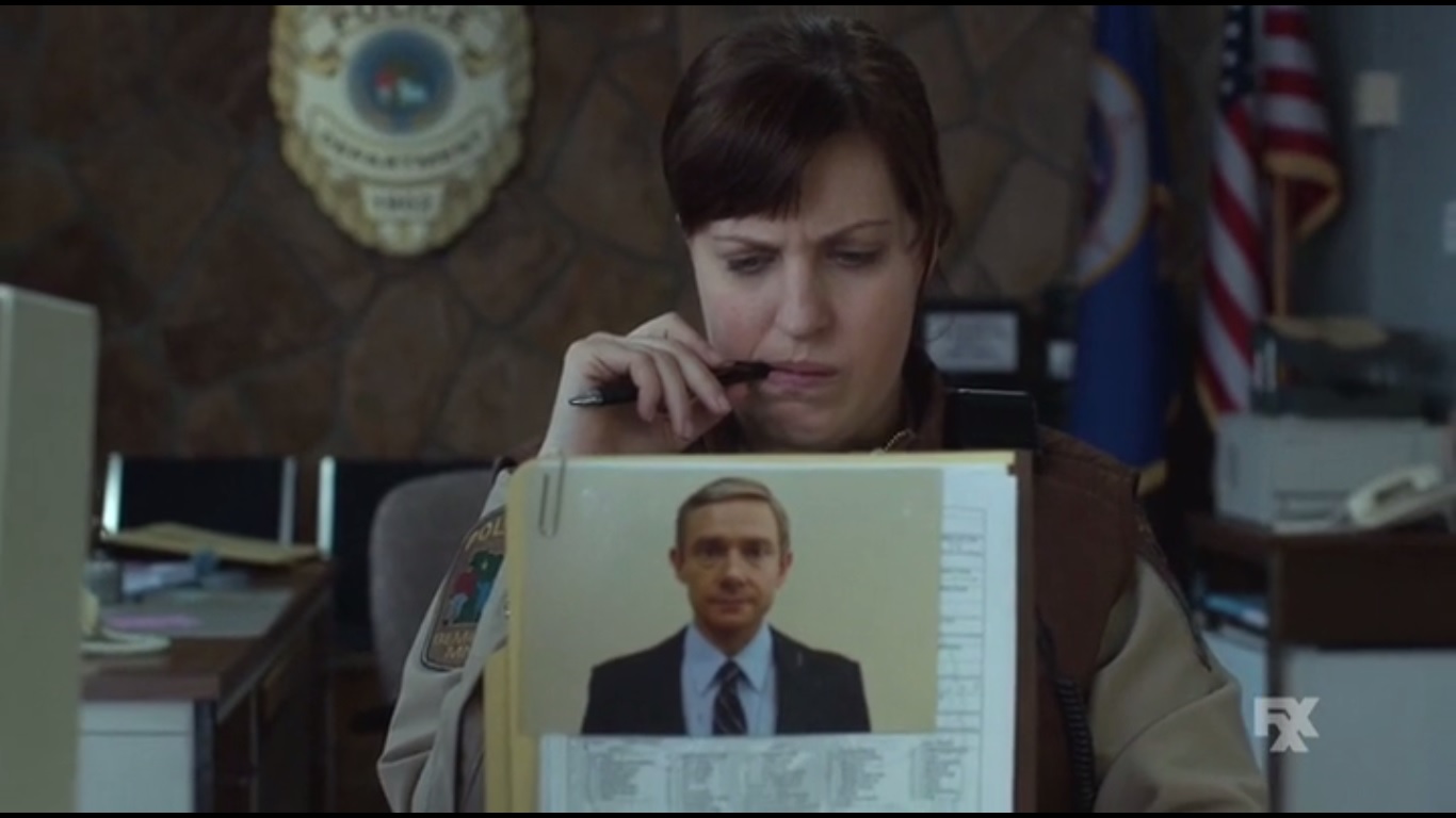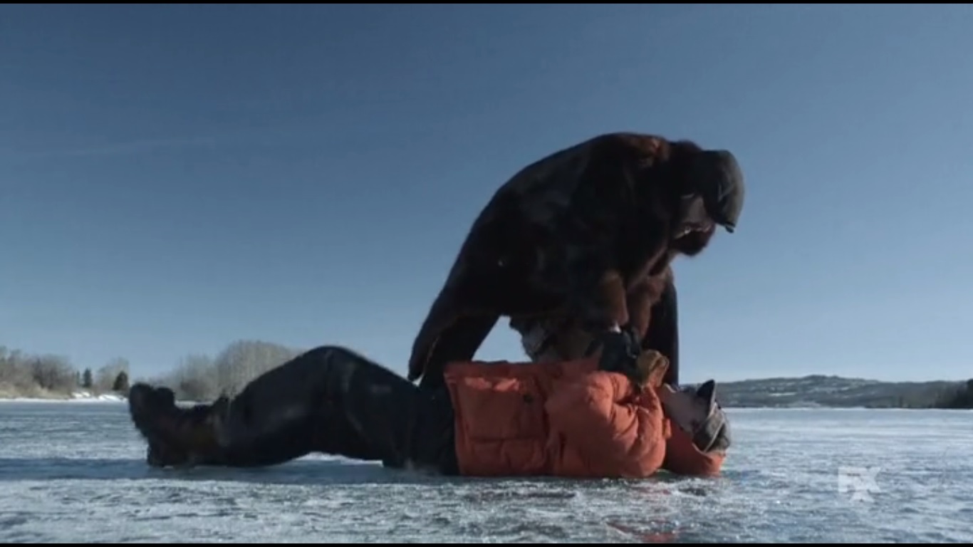 Officer Gus Grimly receives a call from dispatch about a murdered canine report. While approaching the scene, he passes a familiar face and stops when he recognizes it as the man who he pulled over, but let escape. He pulls over and takes part in what has to be one of the most awkward arrests I’ve ever watched. First, he sort of demands that Lorne Malvo freeze, though Malvo begins making a phone call. Grimly draws his gun and approaches Malvo. It’s as if Grimly has never arrested anyone before. I mean, what the heck?