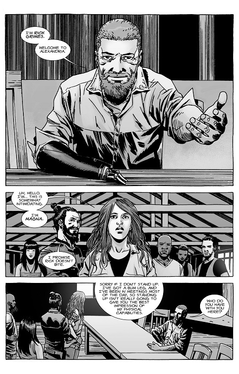 This leads me to Rick, who has really matured into a seasoned leader even though, as he states, he was uncomfortable with the position. His leg hasn’t fully healed since his fight with Negan and he now has a prosthetic for his right hand. Despite his handicaps, Rick maintains the commanding presence he’s had throughout the comic’s run.