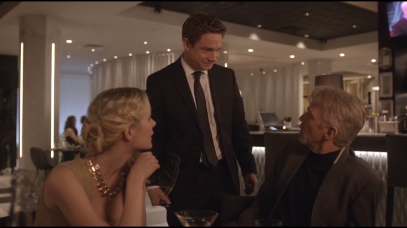 When night arrives, Burt and his wife, Louise, played by Jennifer Copping, meet Mike and his special lady, Jemma Stalone, played by Helena Mattsson. In private, Burt asks Mike if he popped the question to Jemma, which he has. The two are happy together. Burt, not so much. Ever since Louise put the ring on her finger, she won’t take Burt in her mouth. Well, Burt, just take the ring back if you want it that bad. The two make future plans before Malvo heads upstairs and listens to audio on a recorder of what sounds like a desperate man’s pleas.