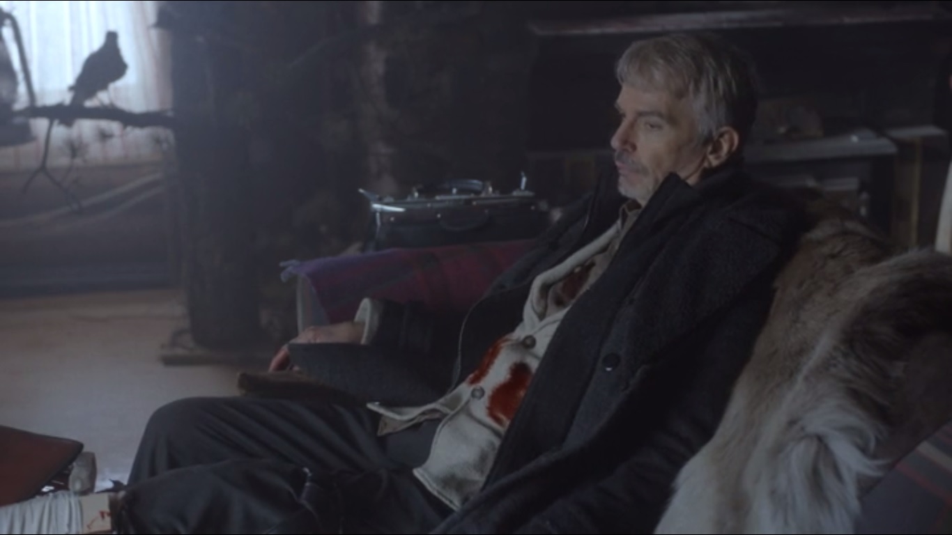 An injured Malvo returns to the cabin and hobbles to the couch to stitch himself up. He manages to force the bone back into place when he spots a wolf outside.