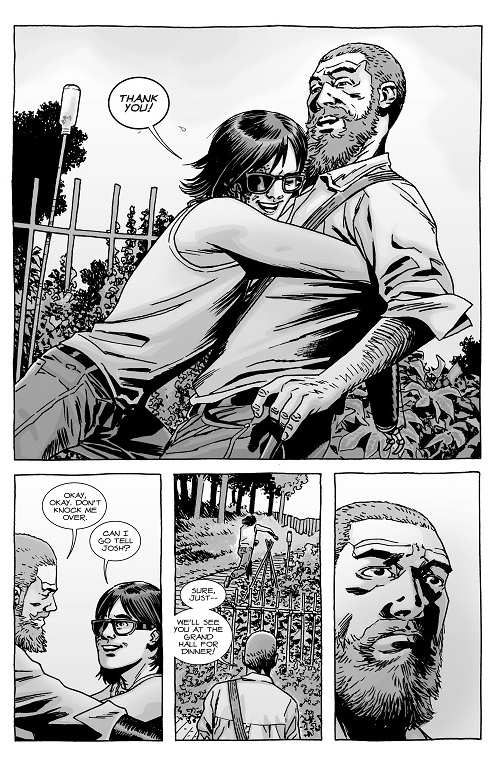 I like where Kirkman is taking the relationship between Rick and Carl. Rick can’t stop Carl from growing up, as much as he’d like to hold onto his little boy forever. Problem is that his little boy has grown up right before his eyes and seen some horrible things. Letting Carl take on an apprenticeship will not only give him something to do, but a sense of purpose. Since Carl lost his eye, there were moments where he doubted his ability to perform. Now, after watching others work to better Alexandria, he feels he can and should do more. It was a nice moment when Rick told Carl that he would be going to the Hilltop. This is something Carl’s wanted for a long time and now he’s got it.
