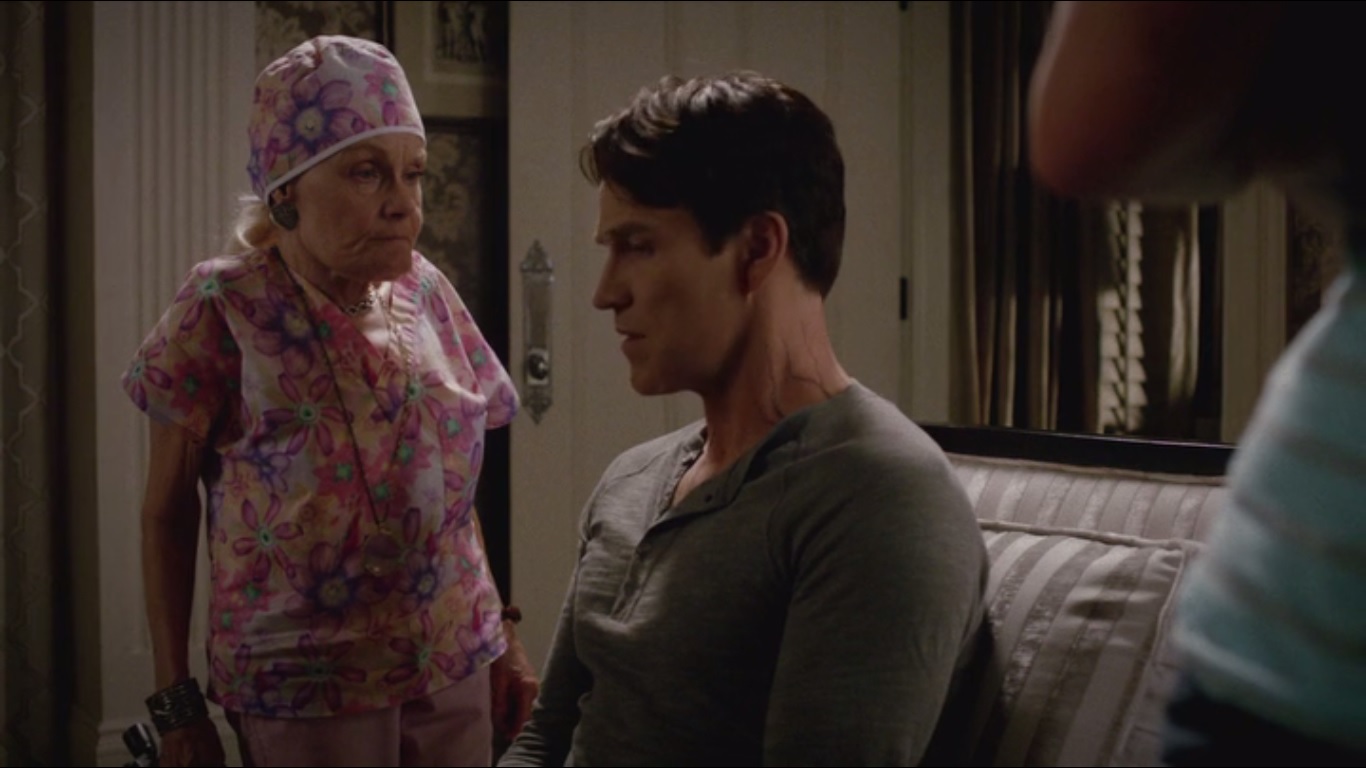 Back in the present, Dr. Ludwig tells Sookie that the virus would not have transferred from her to Bill as a result of the cut on her arm. She’s seen a similar acceleration rate before, but nothing like Bill’s. When Ludwig learns about Sookie’s particular fae line, she shows herself the door.