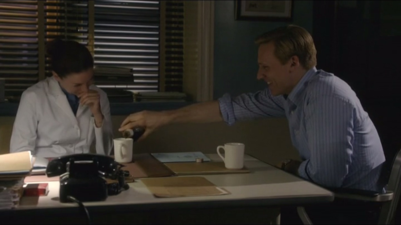 Lucky that Langham was there to reveal that to her. I’m mixed on Langham. Sure, it’s wise of him to speak of how his philandering ruined his marriage, even though he seemed to embrace his lone wolf status earlier on. Austin has been down this road and doesn’t want to see Bill and Virginia, two colleagues who have worked hard to get where they are, throw away all they’ve worked before in the name of infidelity. Screwing around behind your family’s back isn’t worth it and I like how Langham isn’t doing this out of ill will. He doesn’t come off like the type to try and sabotage Bill and Virginia’s affair just to be a prick. That said, I do have a problem when he says that he’s essentially the same as Bill. The circumstances are very different: Bill is cheating on Libby with one woman. Austin cheated on Elise with many, including his own damn sister-in-law! Very different things, Langham!