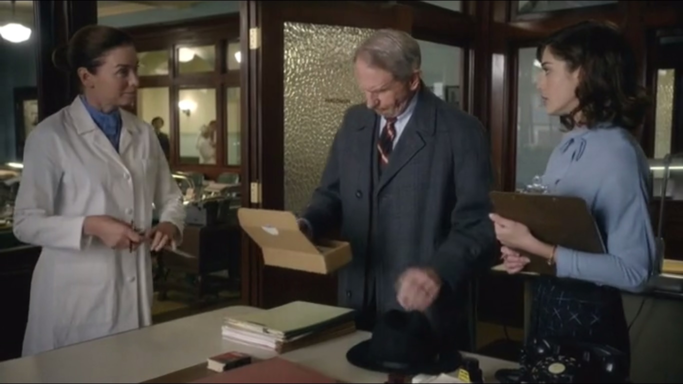 Lillian and Virginia speak with Dr. Papanikolaou, played by René Auberjonois, about wanting to expand access to early screening through an outreach effort to physicians and hospitals. They’d also like to establish a research facility at Washington University for new detection methods and treatments of cervical cancer. The doctor himself is already in the process of making a research center at the University of Miami. He’s shown a prototype of a kit, which includes a skort frim slip. It also includes, as Virginia says, a short film strip. That sounds about right.