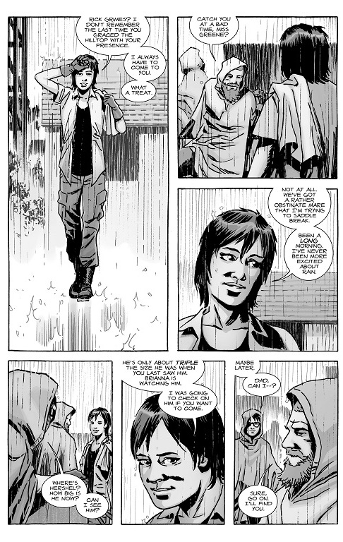 I didn’t expect the follow-up between Negan and Magna’s crew to pop up right at the beginning of the issue, but it was a welcome surprise and well written. And not too surprising that Negan would revert to his old ways after Magna didn’t buy his story. I’m very curious as to what Kirkman will do with Negan. Having Rick keep him alive, to me at least, makes it seem like there’s still plenty for him to do, despite being imprisoned. He’s too interesting of a villain and proved a formidable foe for the people of Alexandria, so I’m glad he’s at least still interacting with the people, however brief.