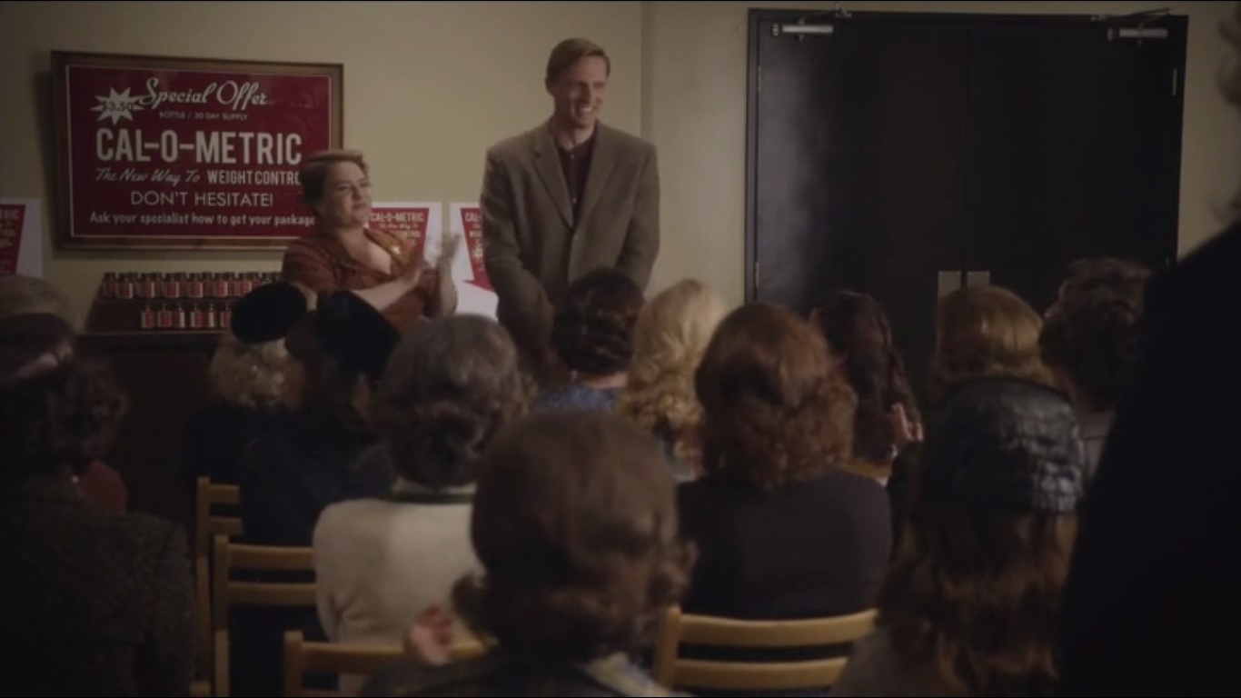 Betty slips in on the Cal-o-Metric sales conference and learns from Flo that the spokesman croaked. Found in a hotel in Alton. There’s probably a reason he only did radio, as he weighed 300 pounds. Huh. But no problem. Flo announces the death, but in death comes life, as Cal-o-Metric has a new spokesman. And just when I can figure out who it could be…