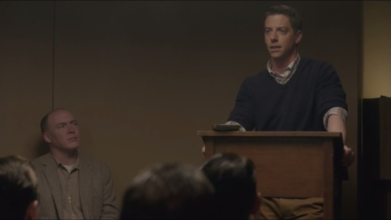 Francis checks in with Betty on Pauline’s upcoming tubing, but Bill hurries him into his office before Betty realizes that Francis doesn’t go by Mason: the last name she’d been provided. Bill isn’t at all pleased about being brought to an A.A. meeting, but Francis thought it would be a good opportunity to reintroduce himself to Bill. He found the courage to tell his story.