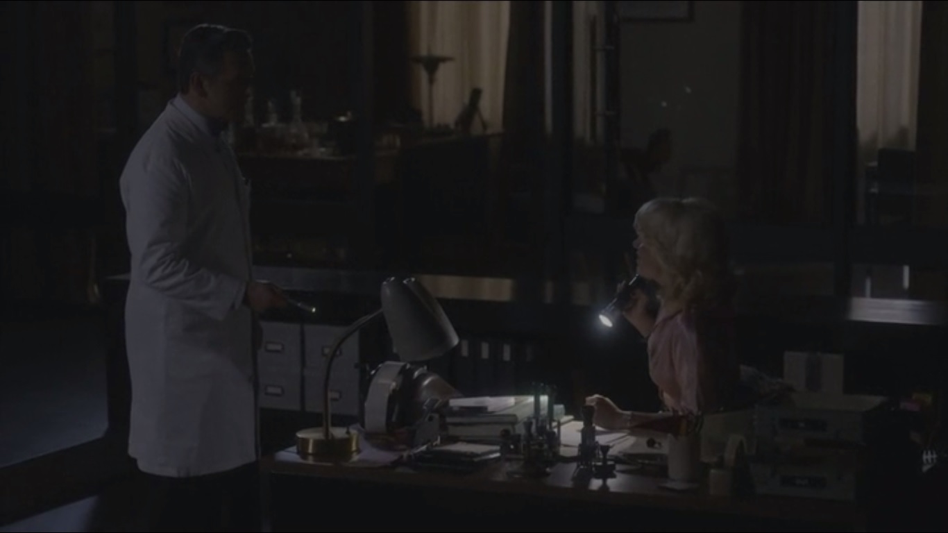 Lester spots a dizzy Barbara making her way down the stairs. Recognizing Lester, Barbara asks if Dr. Masters’ methods work, and Lester says that Bill can cure mostly anything. But Barbara doesn’t believe you can operate on the soul. Lester himself doesn’t believe in God, but Barbara points out that people need to find meaning in something. Lester does, though: the second law of thermodynamics. An insulted Barbara walks off when she gets the implication that Lester finds life meaningless and that pain is random chaos. Smooth move, Lester.