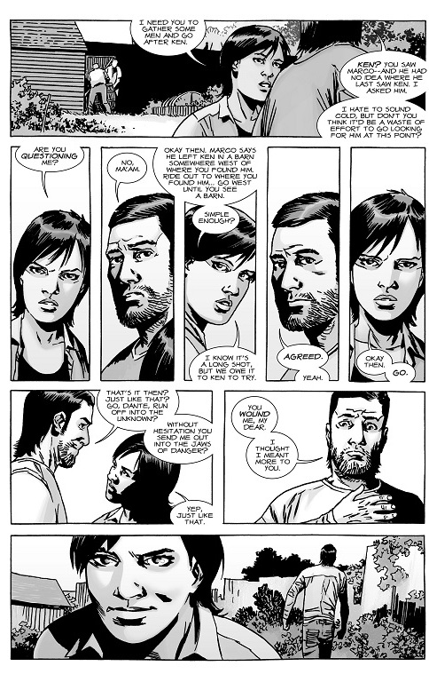 Like the last issue, we’re seeing how the Hilltop residents adjust to normal life. These aren’t the most engaging of scenes, but they’re important because they show how the people are trying to reclaim their humanity. Rick and Maggie’s conversation was one of the highlights of the issue for me. These two have a deep respect for one another and their bond remains strong, despite being leaders of two different groups. First off, it’s very foreboding of Rick to wonder aloud if the dark days are behind them. Fat chance, Rick. These people have never been that lucky and at least Maggie called him out on that. But their talk went deeper than that, with Maggie saying that this life could be preferable to life before the apocalypse. She says that people get along and don’t take each other for granted. They enjoy being around one another, which says a lot, given that most of these people were strangers to one another. We never know how good we really have something until it’s gone. In a twisted sort of way, humanity may have turned out for the better- as far as these people go- because they cherish what they have.