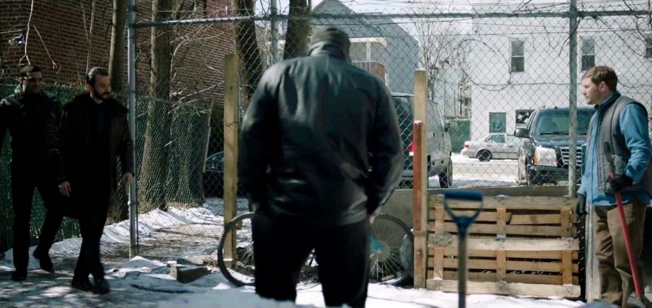 Later on, Bob shoves snow while Marv…supervises. The Chechen mob shows up and the man in charge, Chovka, played by Michael Aronov, demands to know not just about the stolen money, but why the cops know about the broken watch. Just to prove they mean business, the Chechens open the back of their van and reveal a man with a large spike going through his feet. Nasty business. We learn that the Chechens are the real owners of the bar.