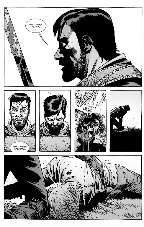 Maggie told Rick last time that if he could do it all over again, he wouldn’t watch any television. Chances are both of them would spend as much time with their families as possible. They’ve both lost people close to them and this is the closest thing to a family they may get, so they savor the little moments. Sure, these moments don’t add much to the overall plot of the issue, but they give the characters a glimpse at how precious life is and how they should cherish every moment.