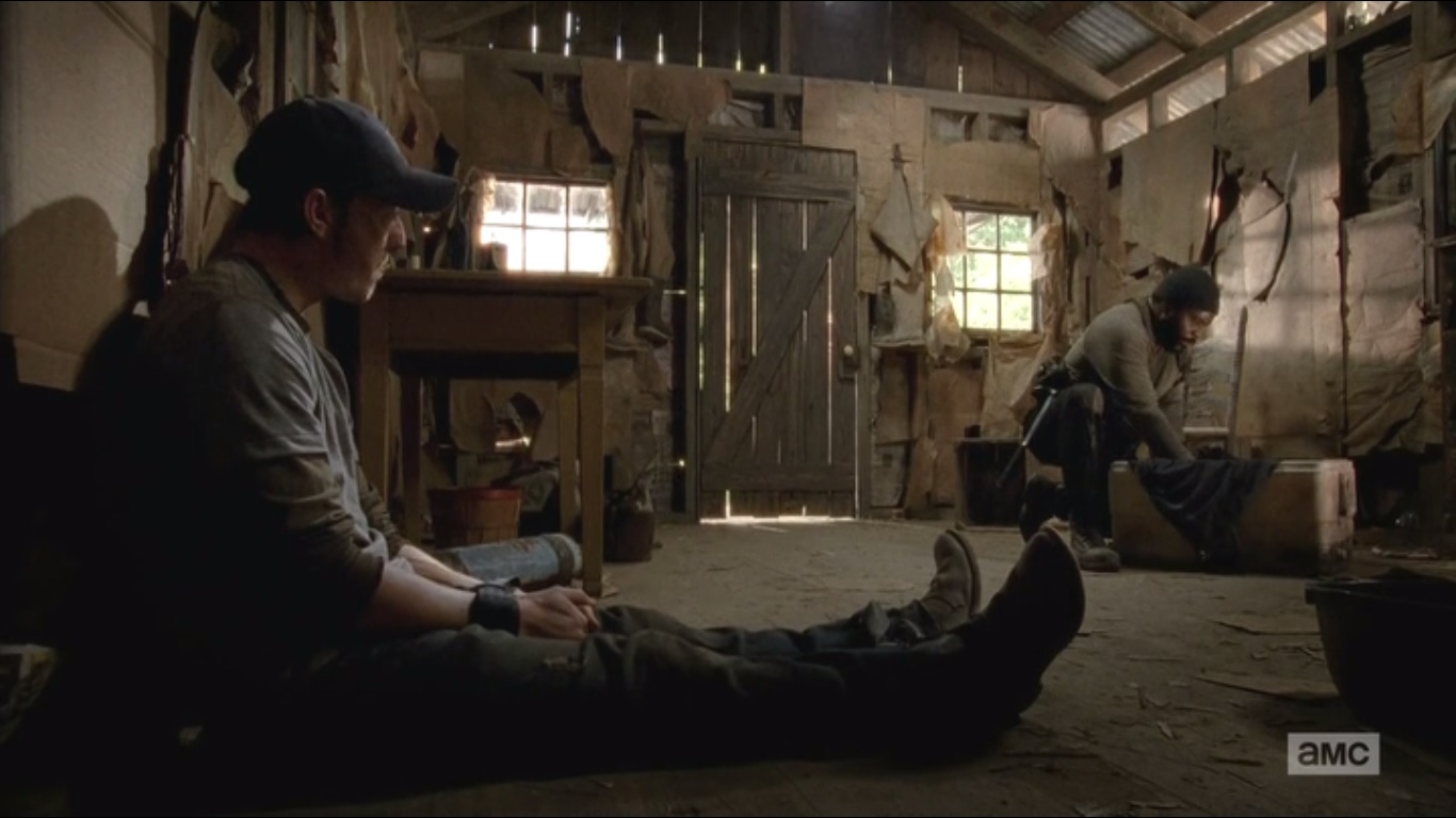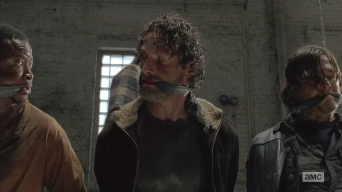 Rick, Daryl, Glenn and Bob, along with some other men, are lined up, gagged and placed in front of an empty tub. In a scene that really doesn’t lack any tension for me because I know the main characters won’t be killed off this soon, two henchmen slit the throats of the men from boxcar “D.” They stop short of killing Glenn when Gareth enters and tells the two to take a shot count. He then removes Bob’s gag so he can speak: Bob pleads for Gareth not to kill them, you don’t have to do this, they can fix this, all that good stuff. No dice.