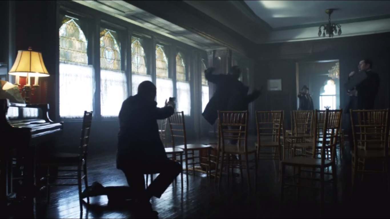Too late. Gladwell arrives, forcing the two upstairs into the mayor’s secret room within a room. A fight breaks out, but Bullock arrives just in time. Before Gladwell can finish the job, Gordon and Bullock put him down.
