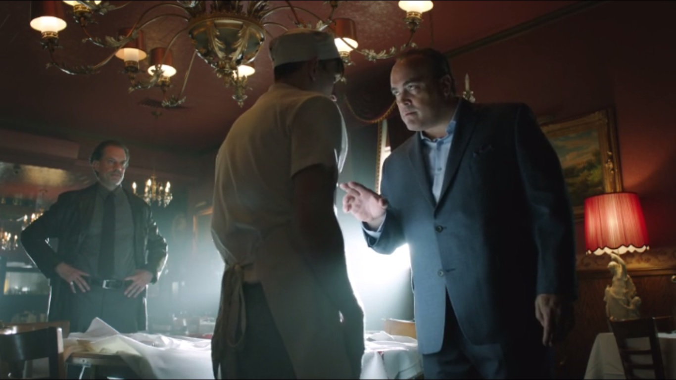 At Bamonte’s, Maroni plans his retaliation against Falcone. He has Oswald brought before him and lets him know that saving the bag of money did not go unnoticed. Oswald’s getting a promotion to restaurant manager! I mean, the position did just become vacant.