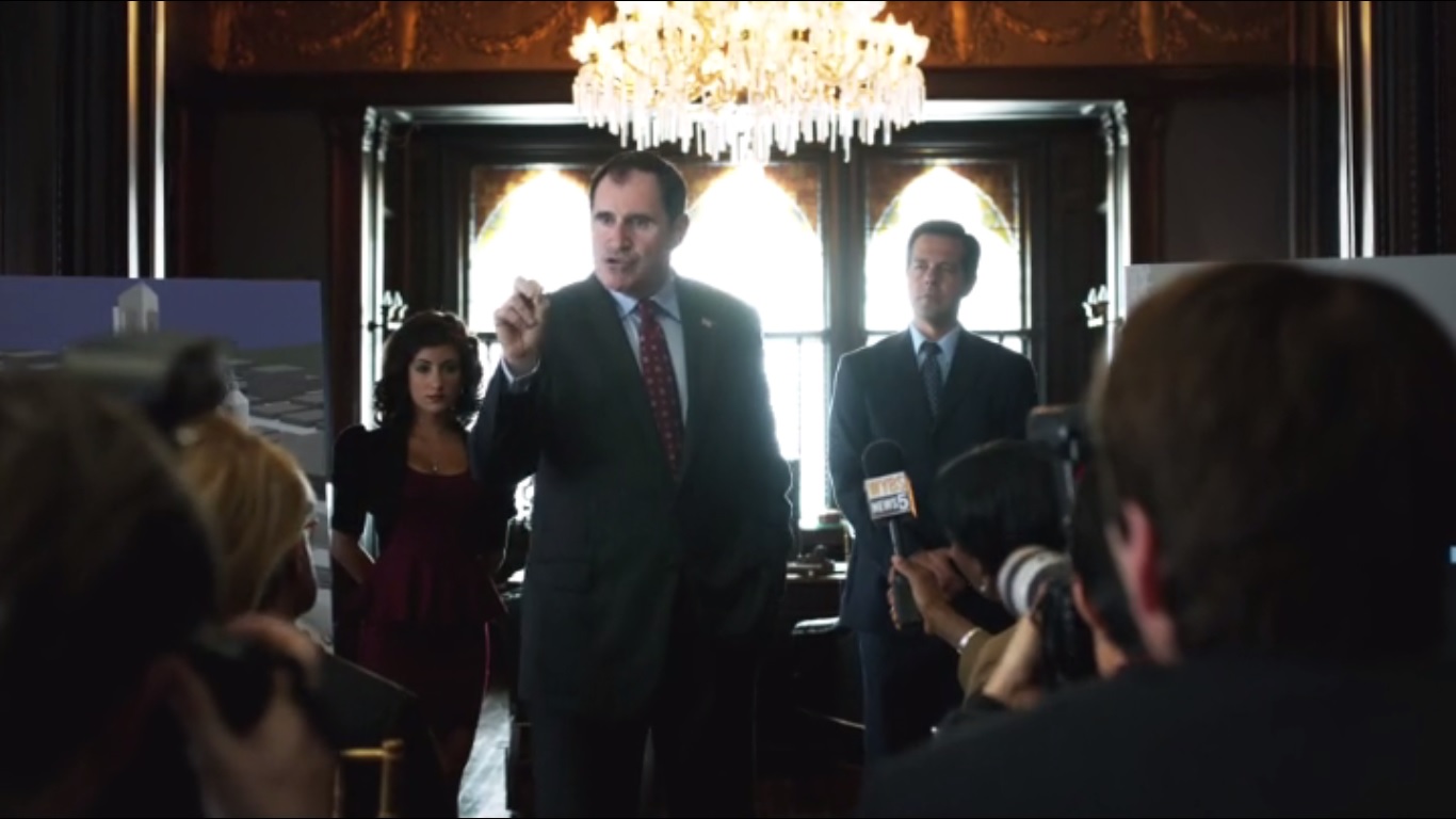 We then cut to a parking structure where Councilman Ron Jenkins, played by Evander Duck, and an aide are leaving for the night. They’re stopped by constituent Richard Gladwell, played by Hakeen Kae-Kazin, who tells the council member that he’s voted for him in every election. How sweet. He has an invention to show and it will only take a minute. When he assembles the device, he tells Jenkins’ aide to put it close to his eye, and he does. He ends up with a blade to the eye. But still, Gladwell really did vote for Jenkins. Well, that’s one less vote you can count on. And that was the final tale of Councilman Ron Jenkins.