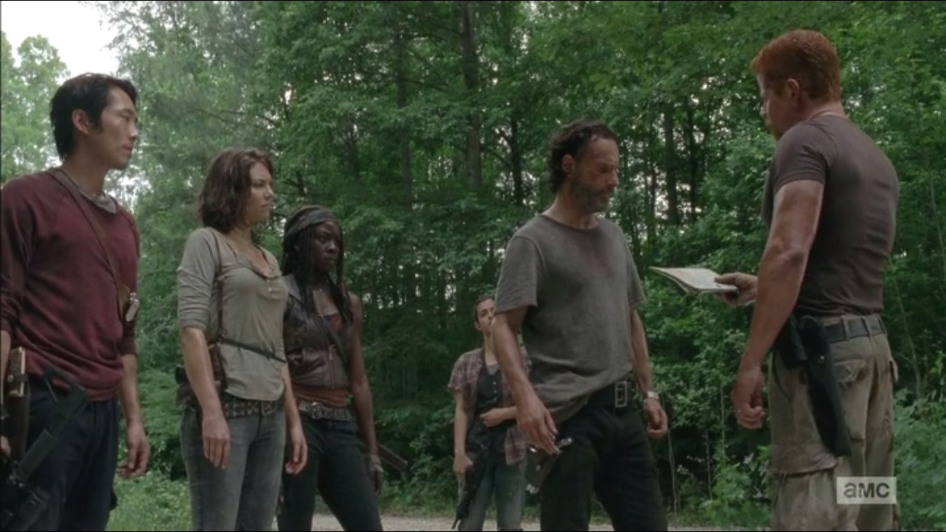 Abraham hands Rick a map of the route to D.C. that they’ll be taking. They’ll stick to it as long as they can. If not, Rick at least has their destination. So after the groups split up again, Rick finds that Abraham has written a note on the map, telling him that the world needs more Rick Grimes’. He then goes to help Tyreese with digging holes.