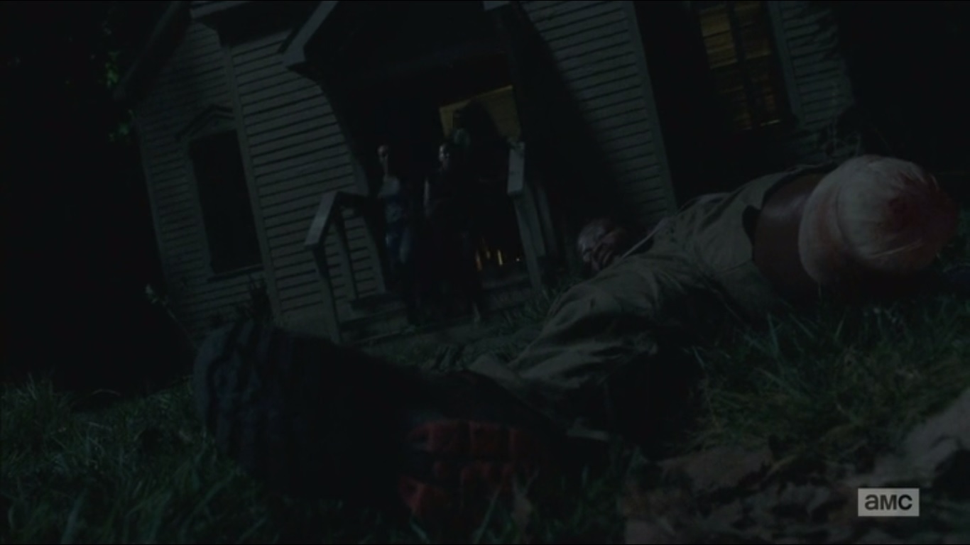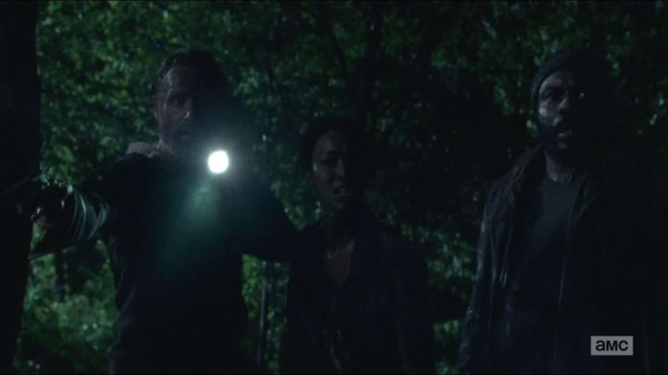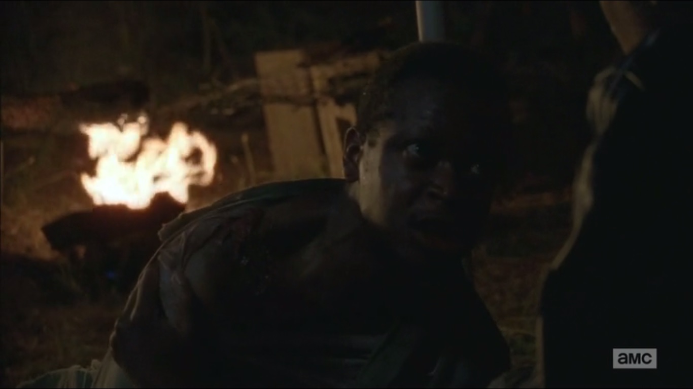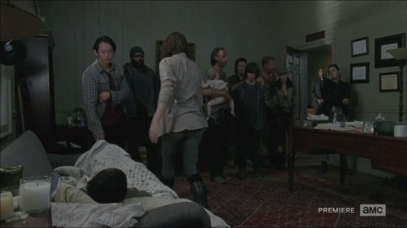 The others prepare for their confrontation with The Hunters. Rick wants to make a move before they do. Sasha wants to be a part of the battle, though Tyreese advises her to stay with Bob in his final moments since she won’t get that time back- the same time that Tyreese didn’t get to spend with Karen. Sasha reminds Tyreese of how he reacted when he learned what happened. In spite of that, Tyreese found forgiveness. Sasha is clearly insulted at the idea of forgiving someone for what they did to Bob, but the decision is hers. She hands Tyreese a knife and tells him to put it through his temple when he stops breathing. Yup, that’s it. Not even a final goodbye or anything.