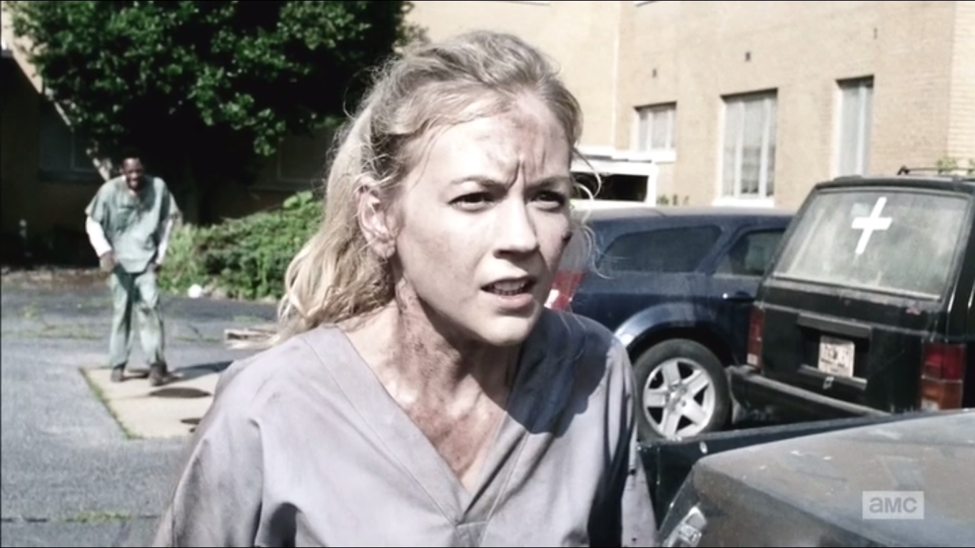 The episode begins with Beth’s eyes. Eye, eye, eye, her eyes hypnotize. She awakens in Grady Memorial Hospital in Atlanta. Right, you forget how little ground Rick and company have actually made in five seasons. Unaware of her surroundings, Beth bangs on the door and demands to be let out.