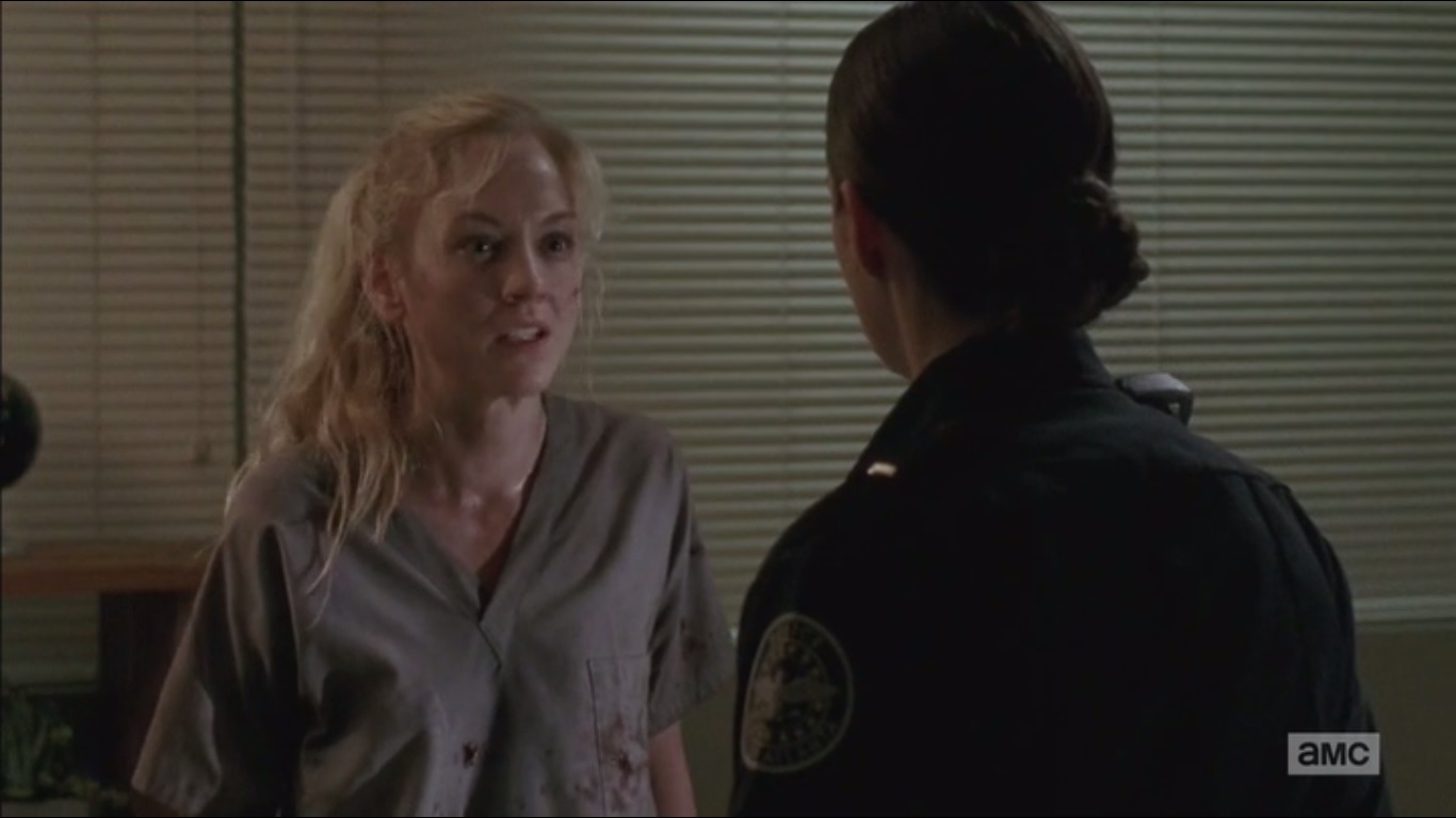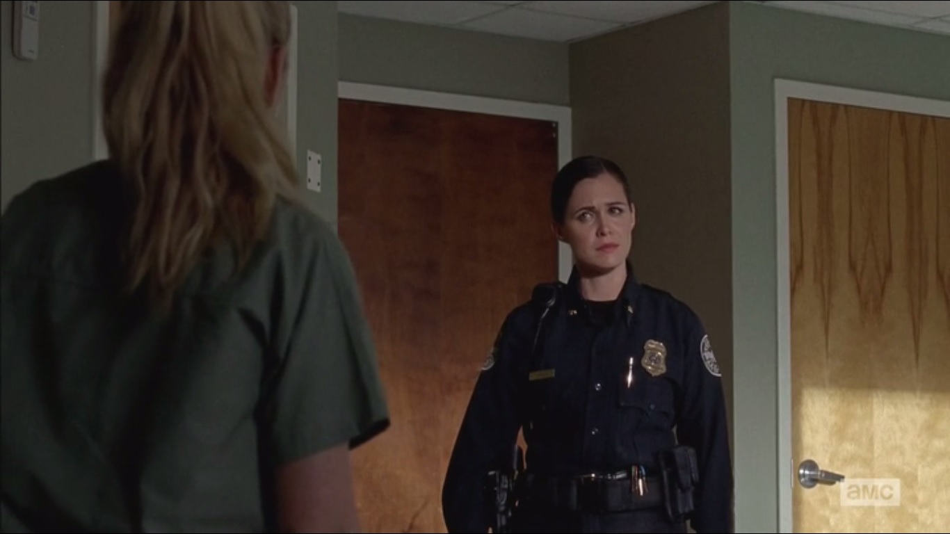 After a few moments, the door opens and we’re introduced to Dr. Steven Edwards, played by Erik Jensen, and Officer Dawn Lerner, played by Christine Woods. We learn that some officers found Beth on the road and she sustained a major head wound. When Beth asks about Daryl, it’s revealed that she had been found alone. For now, Beth owes them. With what? Not like she’s got extra Moonshine or Peach Schnapps.