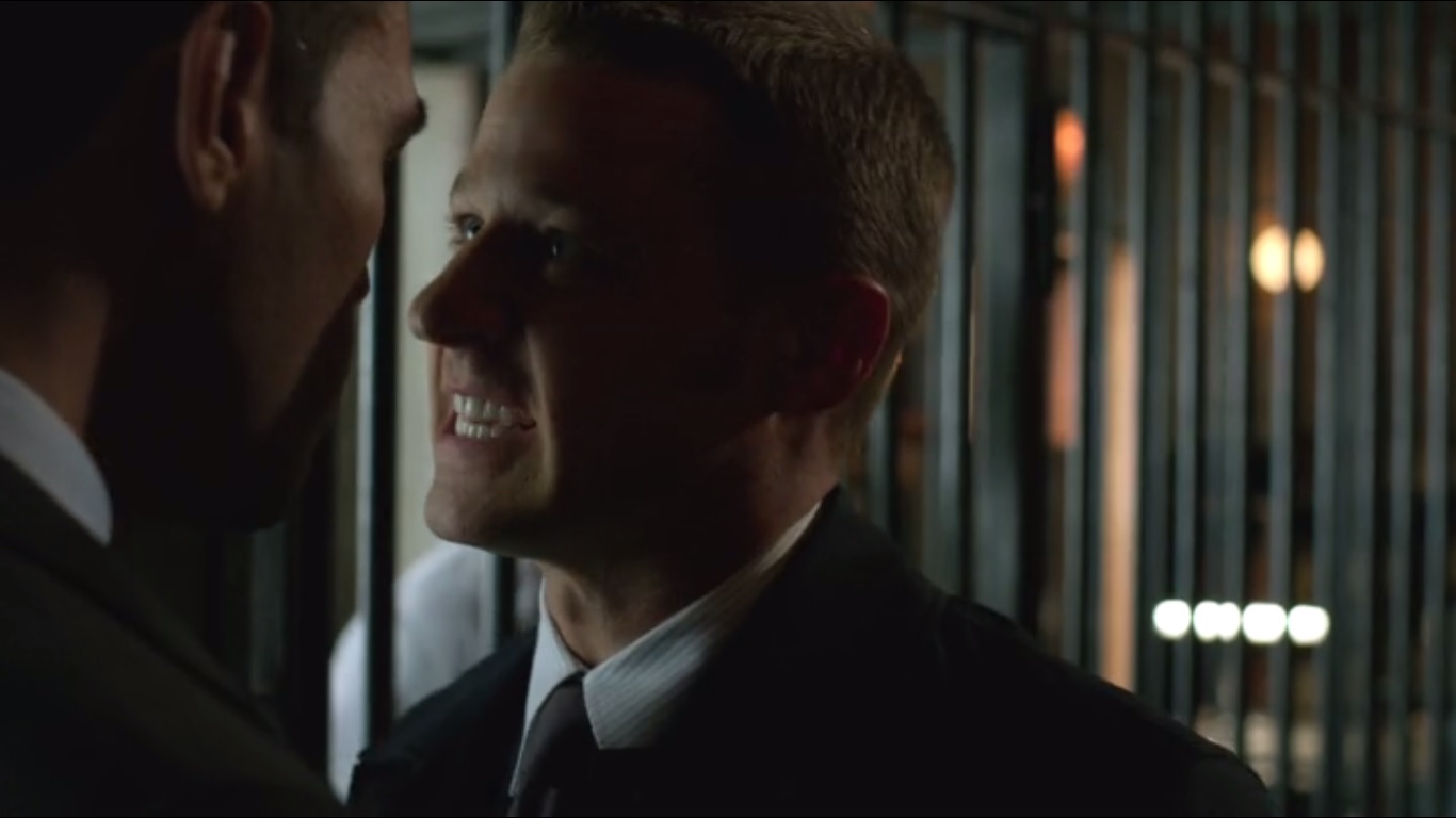 But Nygma may be onto something: printer toner. The medical examiner’s report said the black on the business suit was ink, but it turned out to be toner. More than that, Nygma found staples and graphite chips, meaning that this man must have died in an office building! Yeah, Nygma’s a bit late to the party, but this discovery made him think about another case from a year ago: a young man in a business suit whose esophagus had been lacerated from an index card shoved down his throat. Four men have been killed with office supplies in the last three years. Essen immediately pushes for a confession, but there’s a problem.