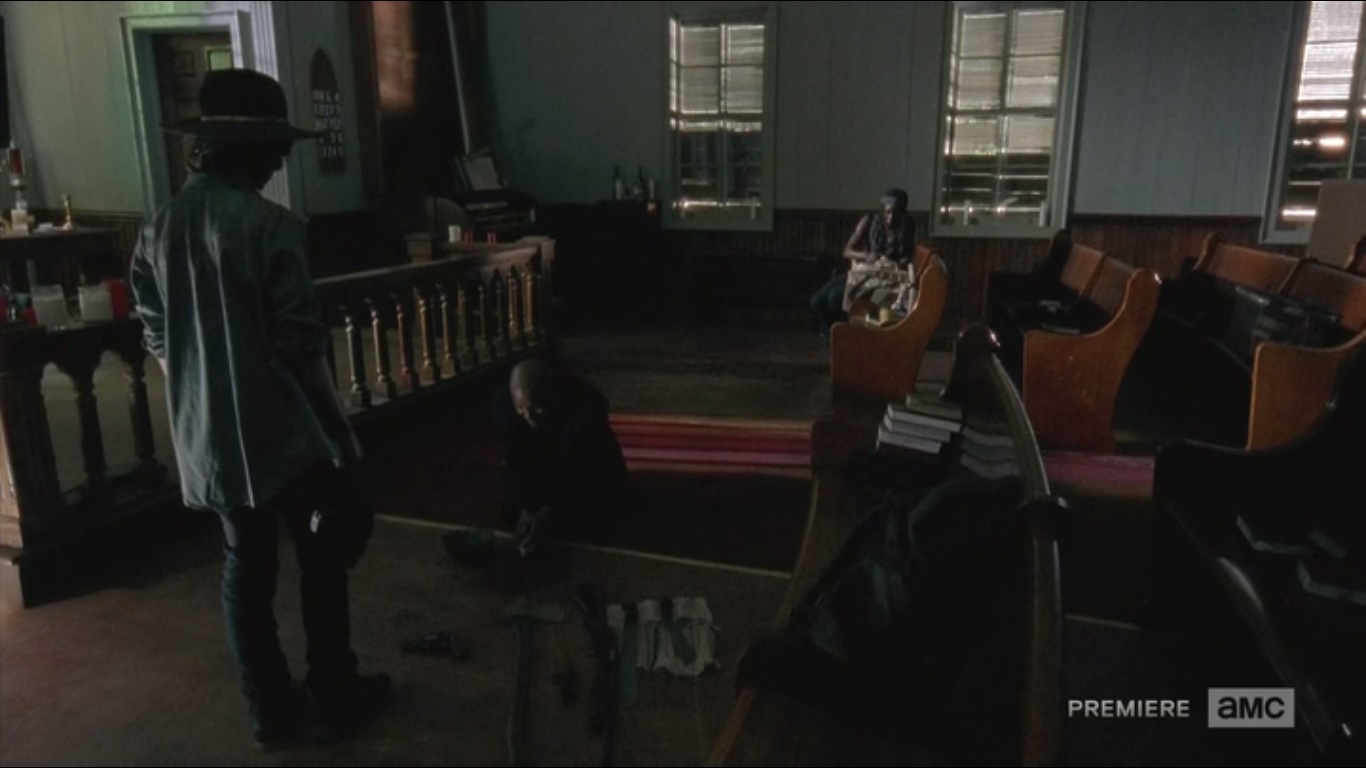 The episode begins back with Rick and company at Gabriel’s church. They’re cutting down pews to board up the windows and doors. Sasha in particular is going to town on some pews, not like they did anything to her. The group splits in two: Rick, Daryl, Tyreese, Sasha and Noah will head for the hospital, while Carl, Michonne, Gabriel and Judith remain at the church.
