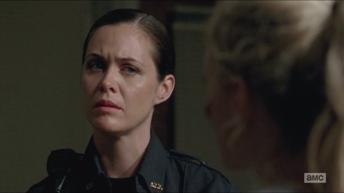 Rick and the others have their three hostages. These cops are different, Noah says. They’re good cops. In fact, they acknowledge that most people at Grady want Dawn gone. One of the officers, Shepherd, played by Teri Wyble, suggests that she and her partner- who I’ll identify in a second- be returned so they can talk with Dawn. Shepherd’s partner shoots this down. The hostage situation can work, but he feels only he can get through to Dawn, given their eight year friendship.