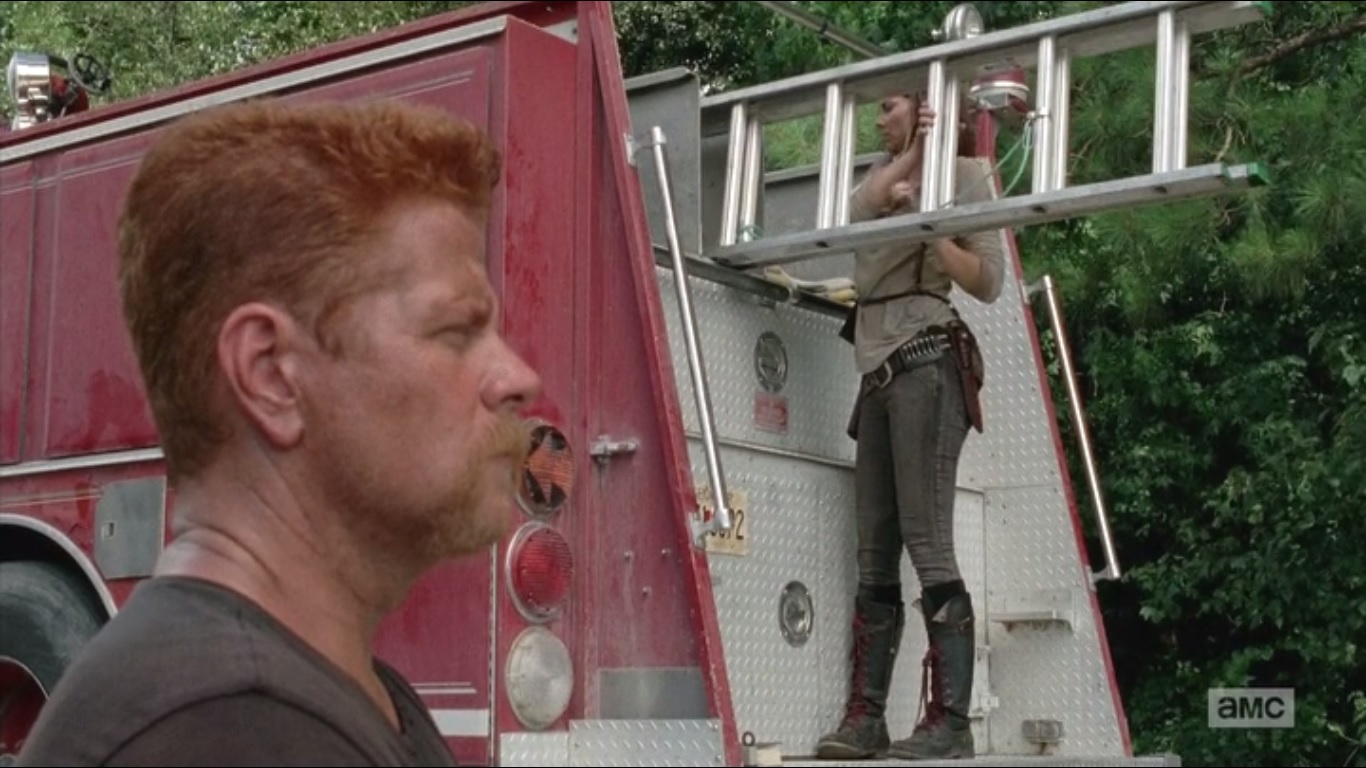 Maggie gets in her daily workout by pulling the ladder from atop the fire truck and setting it up while also shading Eugene. She goes over to Abraham and tells him to get over himself. He’s not the only one who lost something. Plus, it’s not going to get any better than this. Great job keeping hope alive, Maggie.