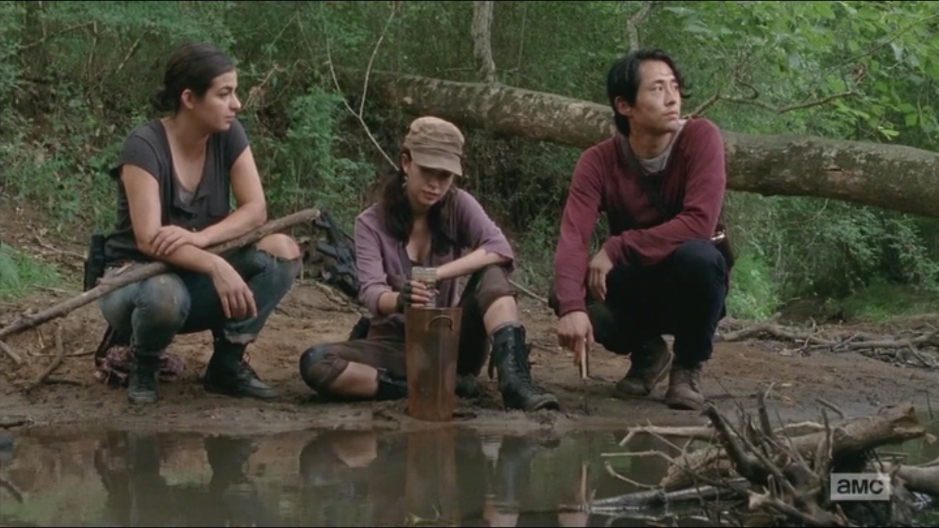 Glenn, Rosita and Tara finally do find some water. It’s not the cleanest looking water, but luckily, Rosita knows how to filter out the filth- a nifty skill she picked up from Eugene. Well, at least there’s that useful skill. We then learn how Rosita came joined up with Abraham and Eugene: she was with a group of people when the shit hit the fan. In Dallas, Abraham rushed in with his truck to help her group. Eugene had been with him and informed her of his mission. Seeing her skills, Abraham asked Rosita for her help- the first time anyone had ever asked her that since all of this started. My best guess is that if men asked Rosita for anything up until that point, it wasn’t help.