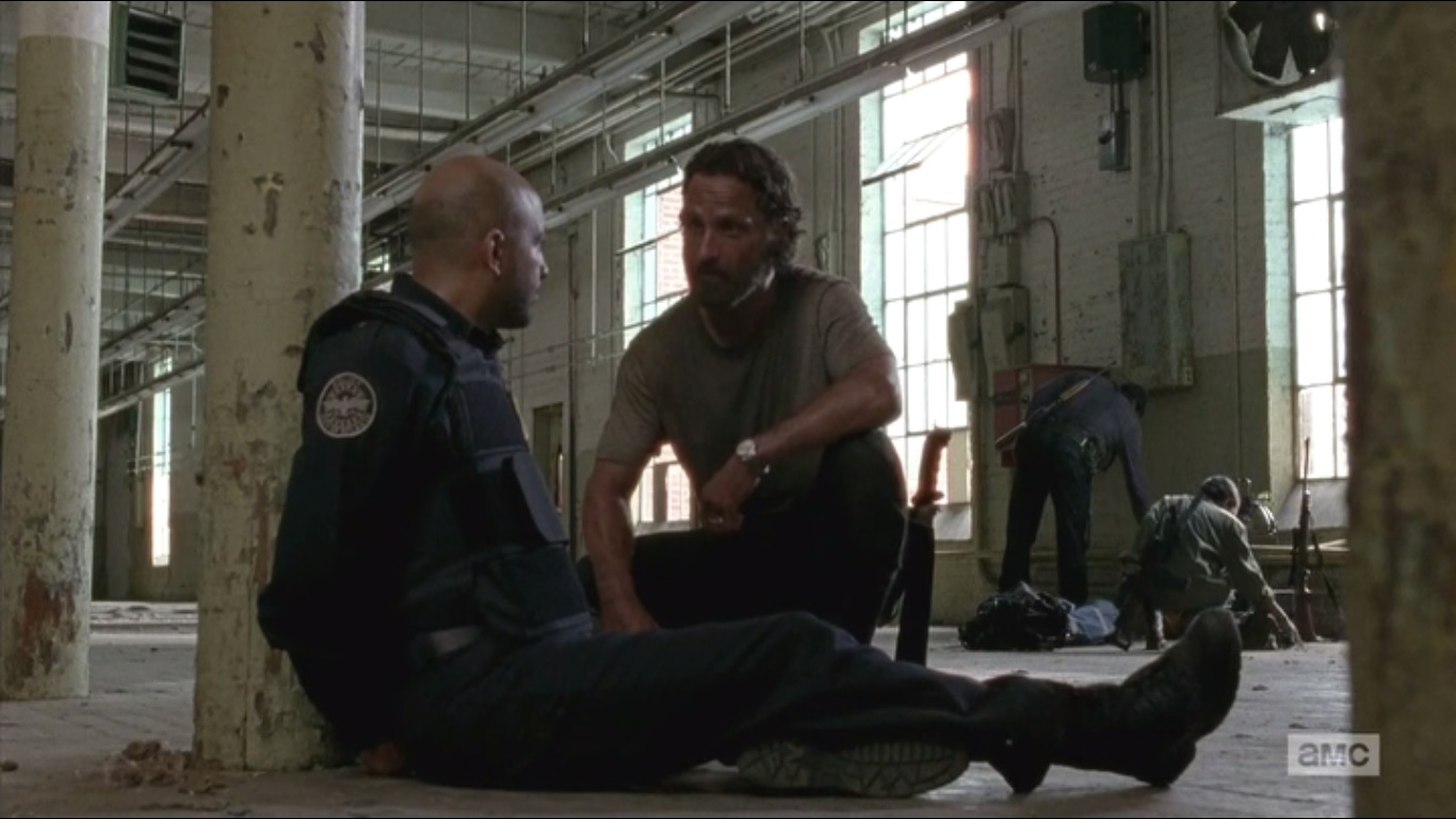 The other officer explains to Rick’s group that Dawn will not compromise, but secretly, she wants to. Rick asks the man if there’s anything else he needs. He’s fine, but he finally identifies himself: Sergeant Bob Lamson, played by Maximiliano Hernández. Well, isn’t that a fine coincidence. Even though Rick tells Bob that he’s still a cop, Bob is convinced that all of the real ones are gone.