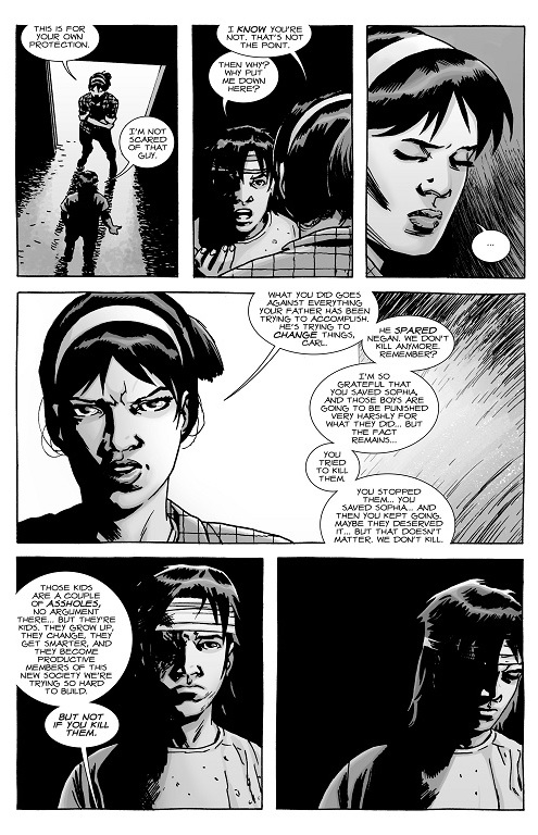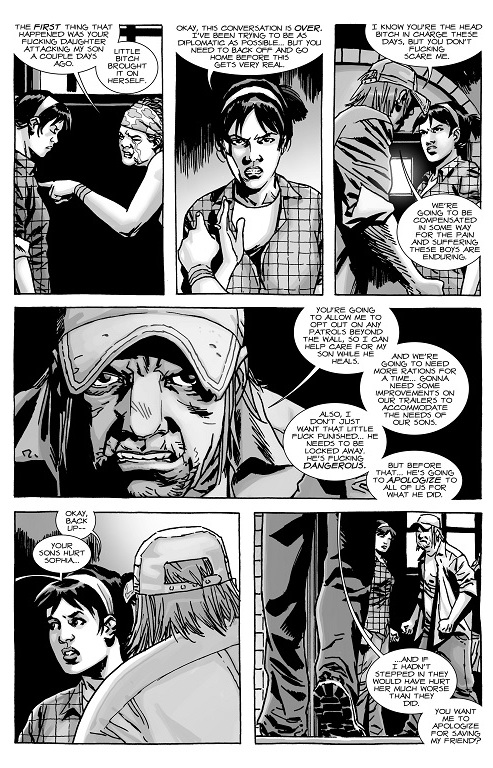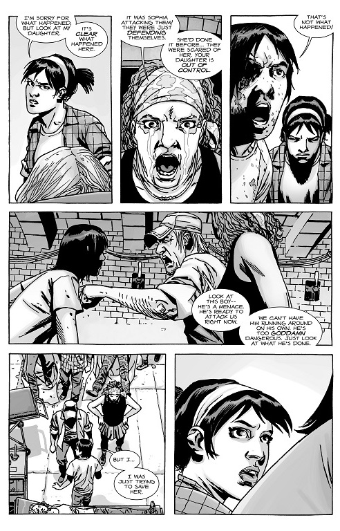 And they are overstepping their boundaries to suddenly demand compensation from Maggie. I assume Kirkman doesn’t want us to like these people because they take no responsibility for what their kids did to Carl and Sophia. They’re way too rash and quick to react without considering the possibility that their kids instigated the violence.