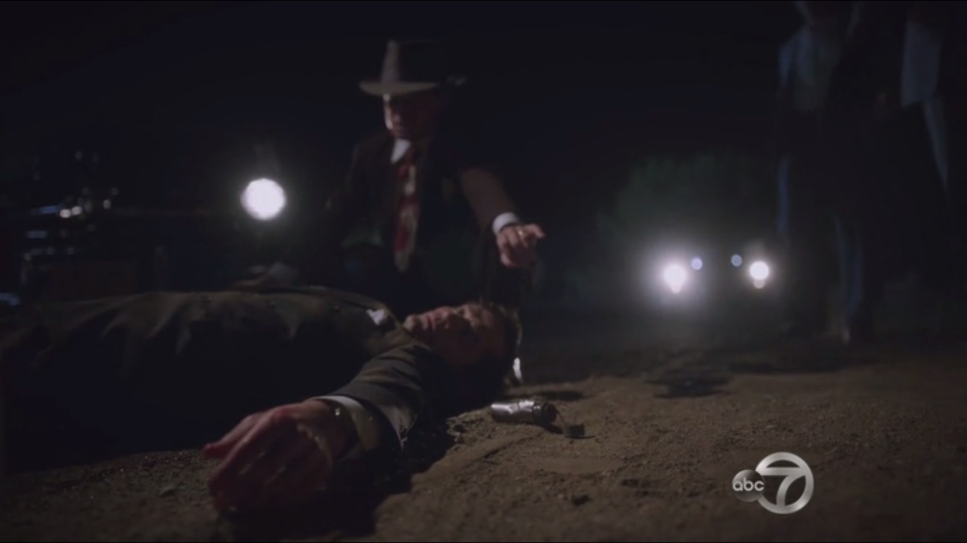 Brannis is at death’s door and his speaking device is wrecked. Peggy tries to get any information out of him about Leviathan or Howard Stark’s weapons, but Brannis draws a heart with a line through it in the dirt. With that, Brannis dies. Peggy and Jarvis make their escape from the approaching authorities.