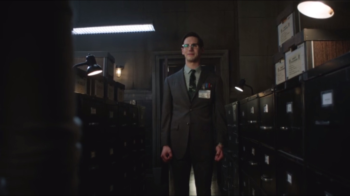 We then get a brief scene of Nygma entering the GCPD locker room and toying with one of the lockers. This will be more important in a bit.