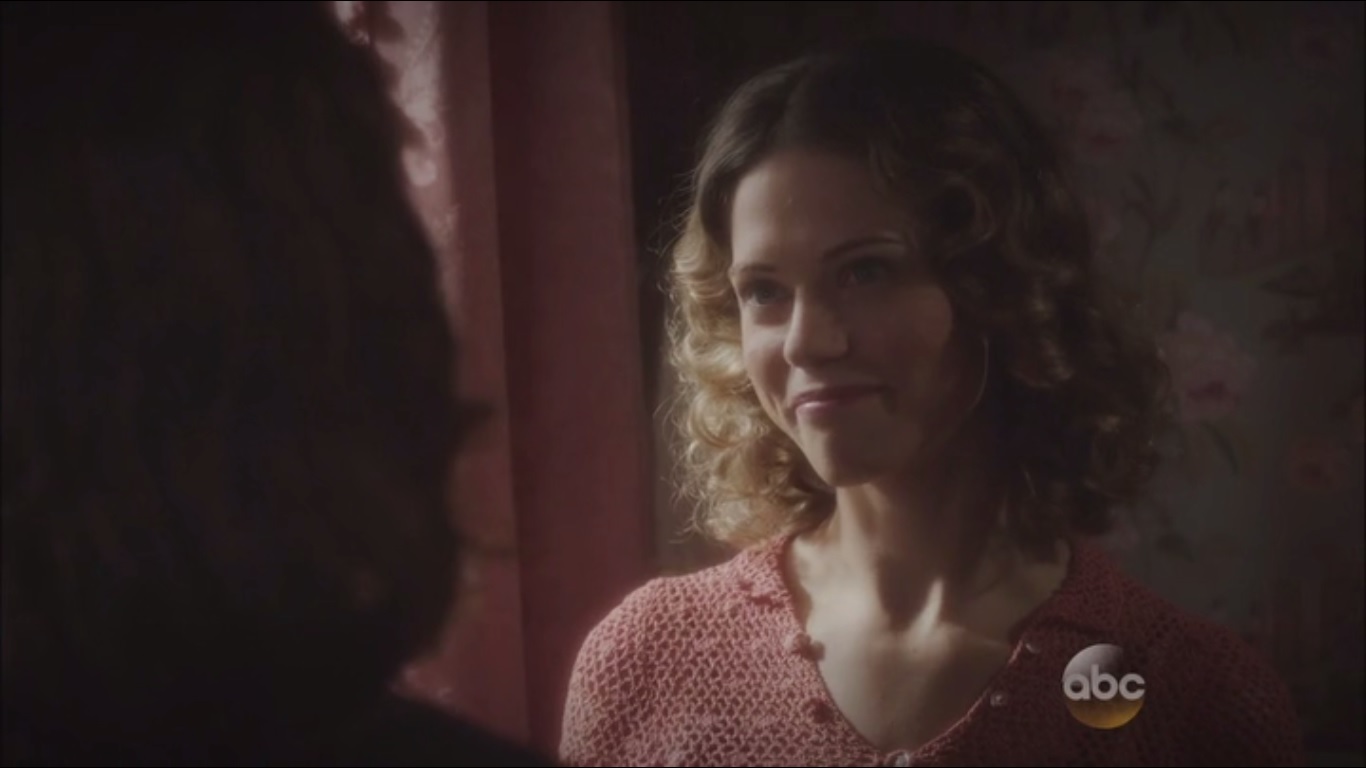 The agents question Angie on Peggy’s activities, and they’re pretty routine. No strange men, though. After all, curfew is at 10. No guys above the lobby. She saw Peggy awhile, but Peggy apparently said she would be busy for some time. No specifics, but it might have had something to do with her sick grandmother. Angie puts on her best crying performance- that we’ve seen, anyway- and thinks of her nanna, who is so supportive of her acting career. She even cries on Thompson. And what’s the name of Thompson’s grandmother? Gam-Gam. Well! Once the agents leave, Angie brings Peggy into her room.
