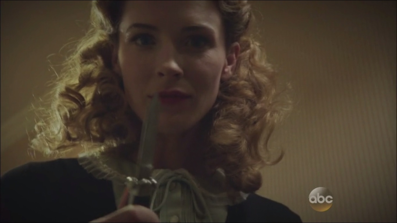 Oh, but then Peggy feels weak and recognizes that Dottie is wearing her brand. Peggy has enough time to notice the scars on Dottie’s wrists before fainting. With that out of the way, Dottie pulls out a switchblade.