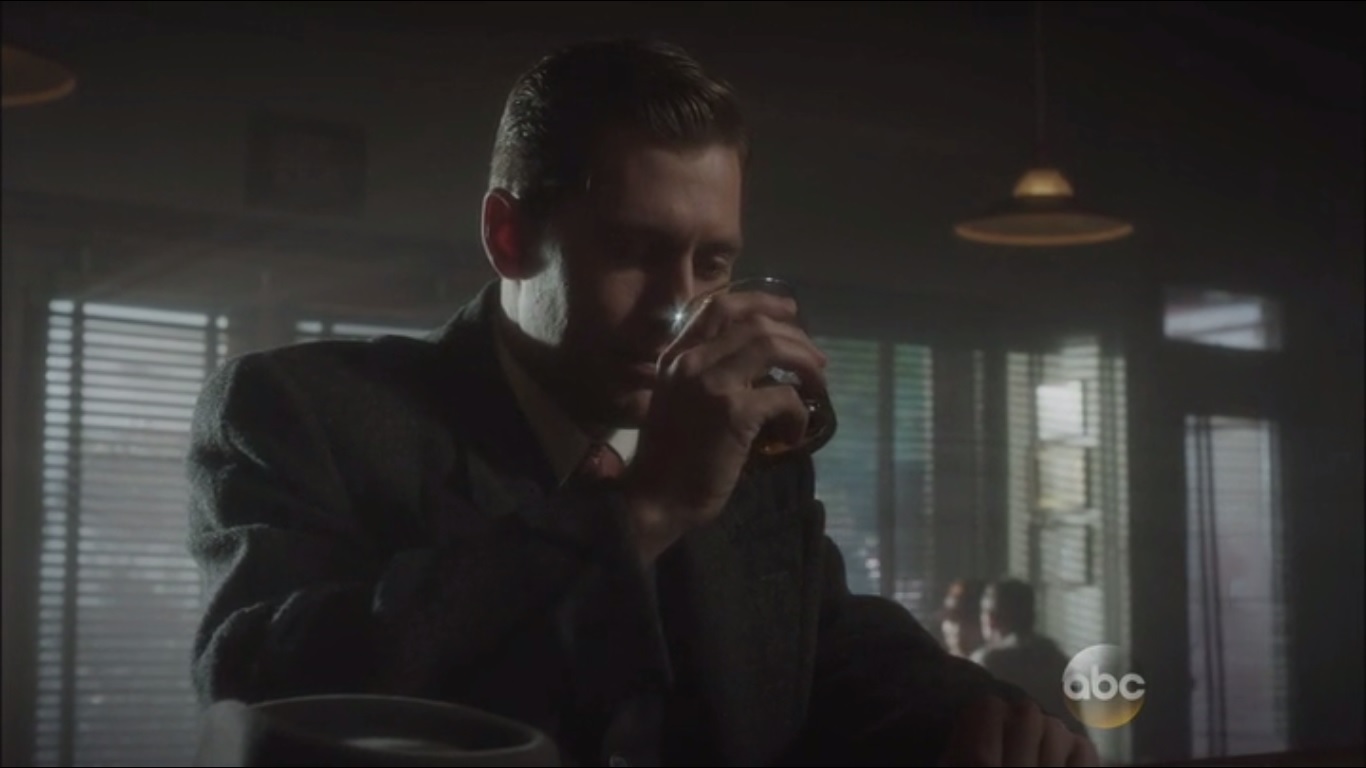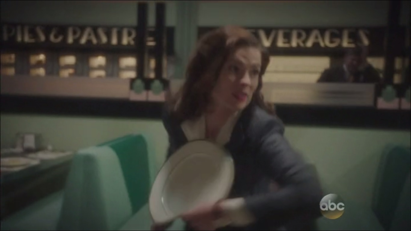 But then Peggy notices everyone suddenly leaving the Automat. This is Procedure 791, which involves isolating the subject and remove civilians from harm before attempting arrest. The man at the counter is Agent Messner from Washington, D.C. The man behind Carter is Agent Reese. Peggy needs Jarvis to find a way to block the front door so no one else can get in. As the agents advance, Carter and Jarvis make quick work of them and escape out the back.