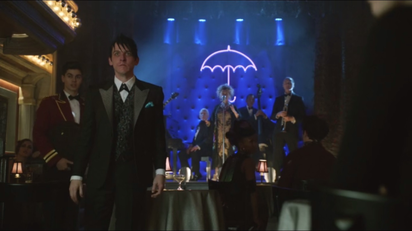 Gertrude is done performing. Penguin gets the applause started until some guy boos her. Penguin goes to handle business.