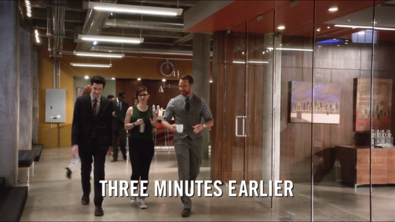 Three minutes prior to this, Kelsey, Clyde, and Doug discuss their app when Denna storms by. Clyde then receives a phone call from a company that has a major interest in their app. That company? Why, Google, of course. The three are ecstatic and plan to celebrate with a re-launch party, though Doug hopes that this moment of happiness means that he and Kelsey can have sex one more time. Not gonna fly, Doug.