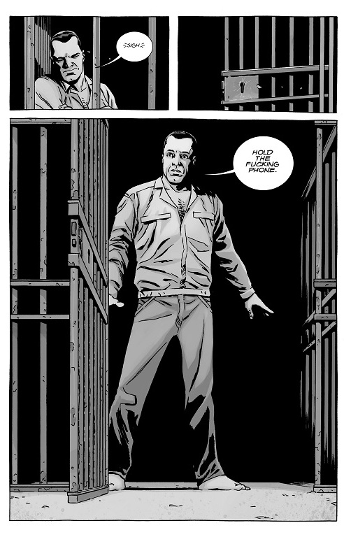 Now, as for this ending- Robert Kirkman once again throws in another curveball. So Negan gets cleaned up a bit. Okay, that’s fine, but then the lock on the cell is off and the man is free. I don’t know how that happens without someone noticing, given how on guard Andrea and the others were when cleaning down Negan. Though I’m sure Rick would be aghast that Negan was even let out at all. Now, however, he’s apparently free.