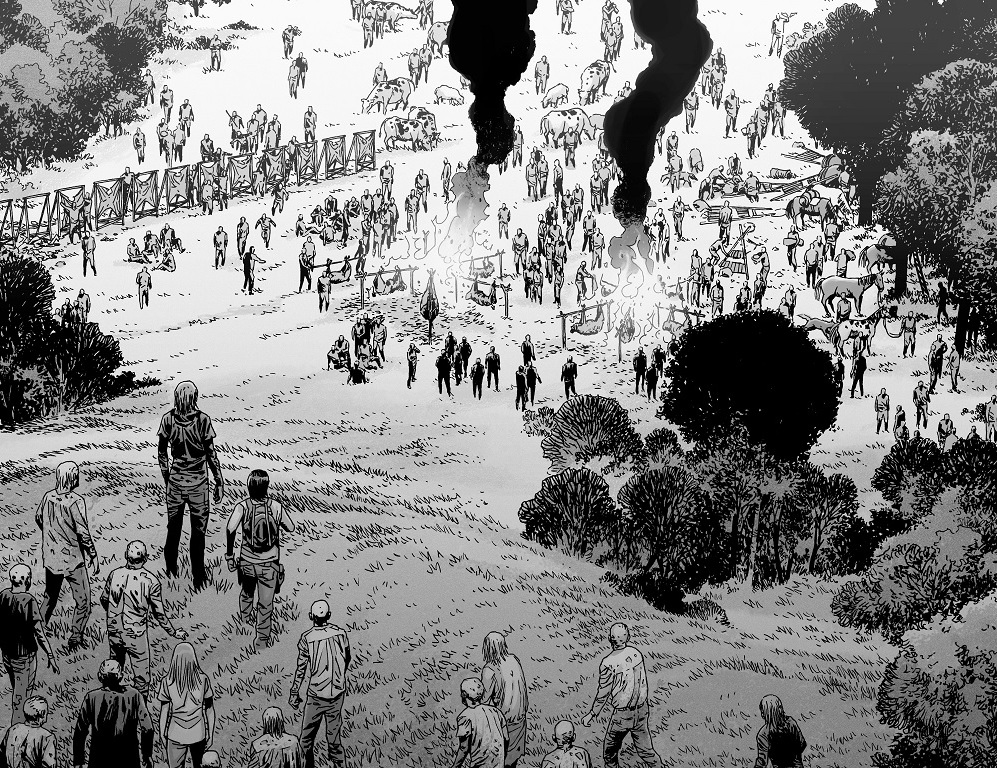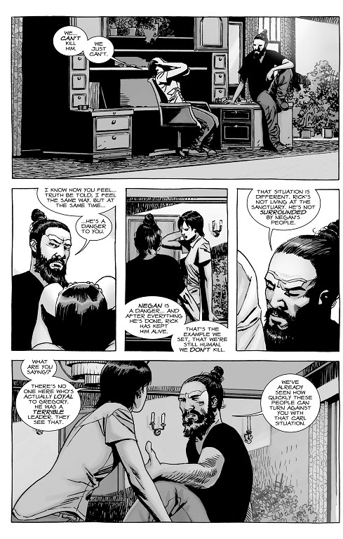 Briefly on Rick and Michonne, as their conversation kicks off the issue and picks up directly from the end of the previous one. Michonne still talks about the life she deserves to have, which isn’t one of happiness. She’s not wallowing in pity, but she isn’t embracing the current lot that life has given her- a second chance.
